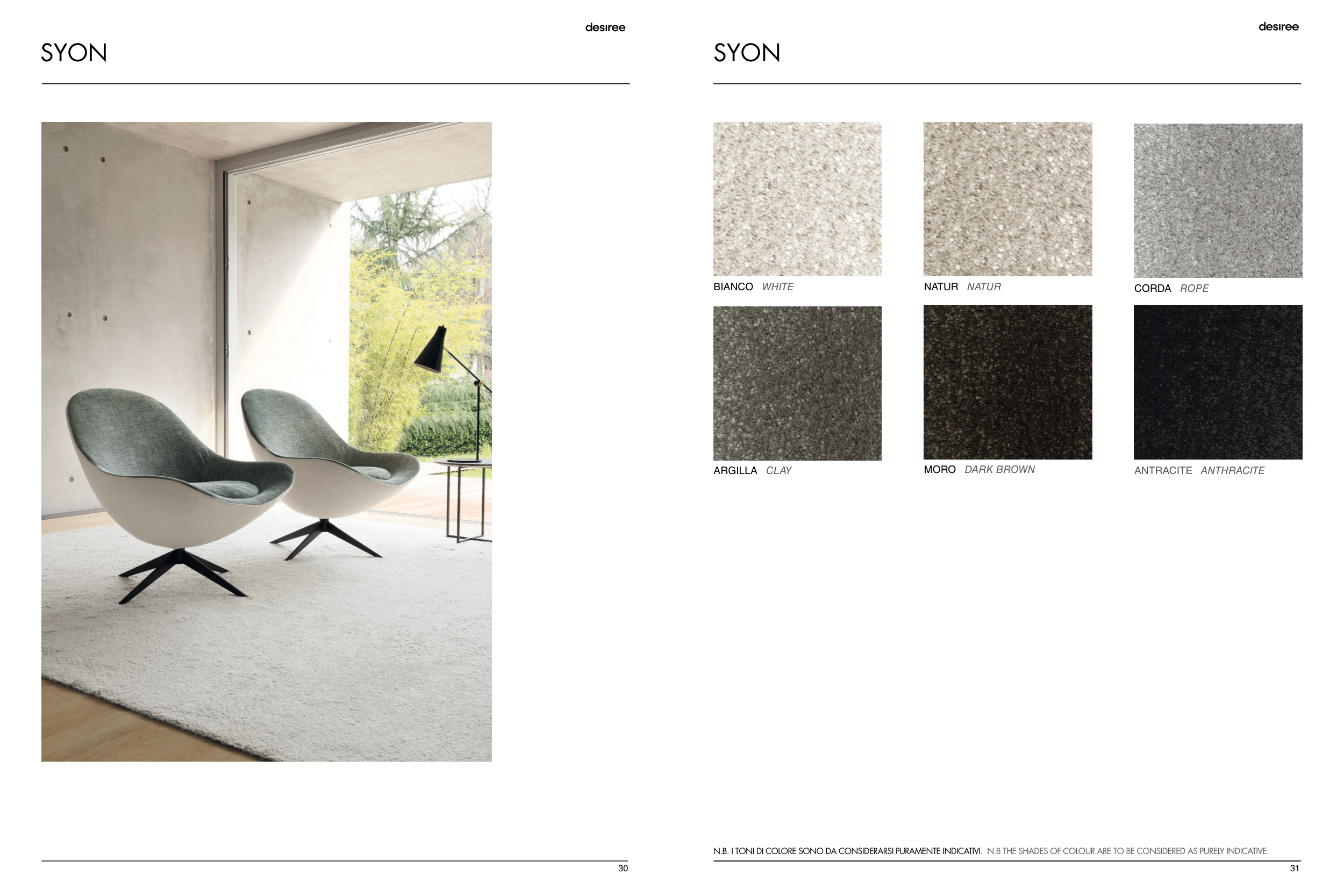 N.B. I TONI DI COLORE SONO DA CONSIDERARSI PURAMENTE INDICATIVI. N.B THE SHADES OF COLOUR ARE TO BE CONSIDERED AS PURELY INDICATIVE.