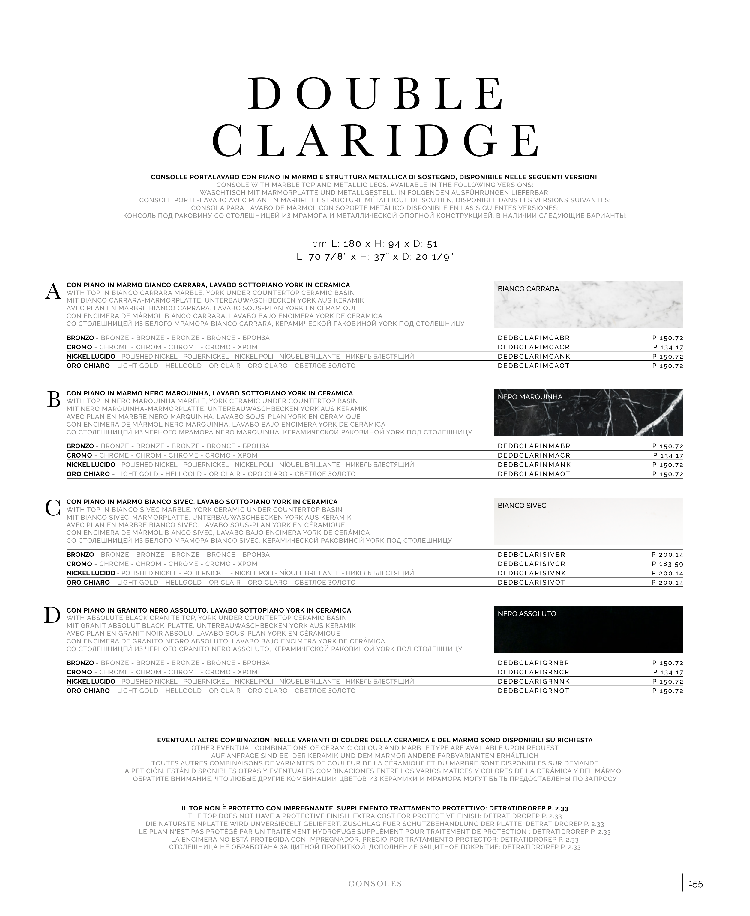 EVENTUALI ALTRE COMBINAZIONI NELLE VARIANTI DI COLORE DELLA CERAMICA E DEL MARMO SONO DISPONIBILI SU RICHIESTA