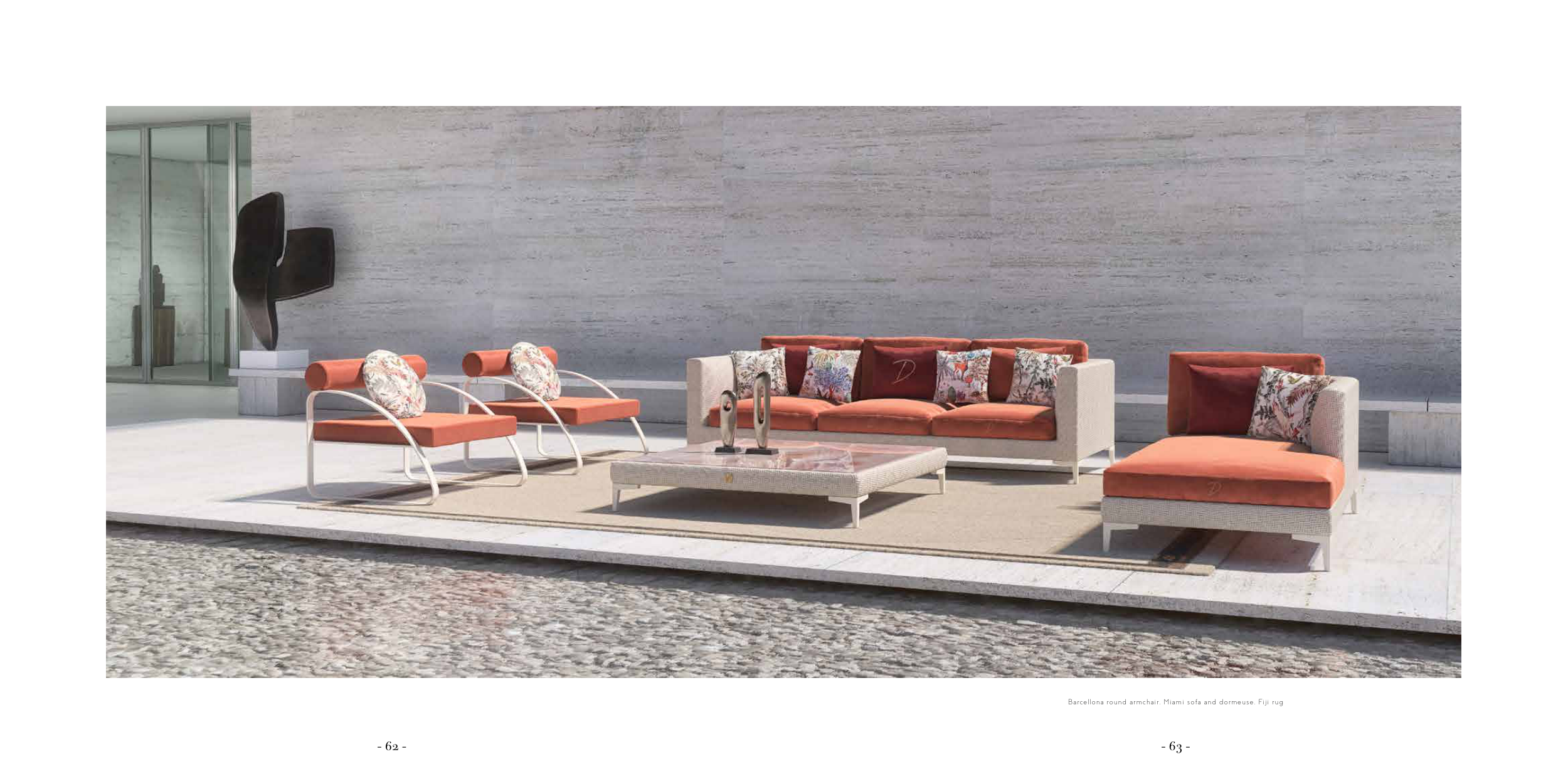Barcellona round armchair, Miami sofa and dormeuse, Fiji rug