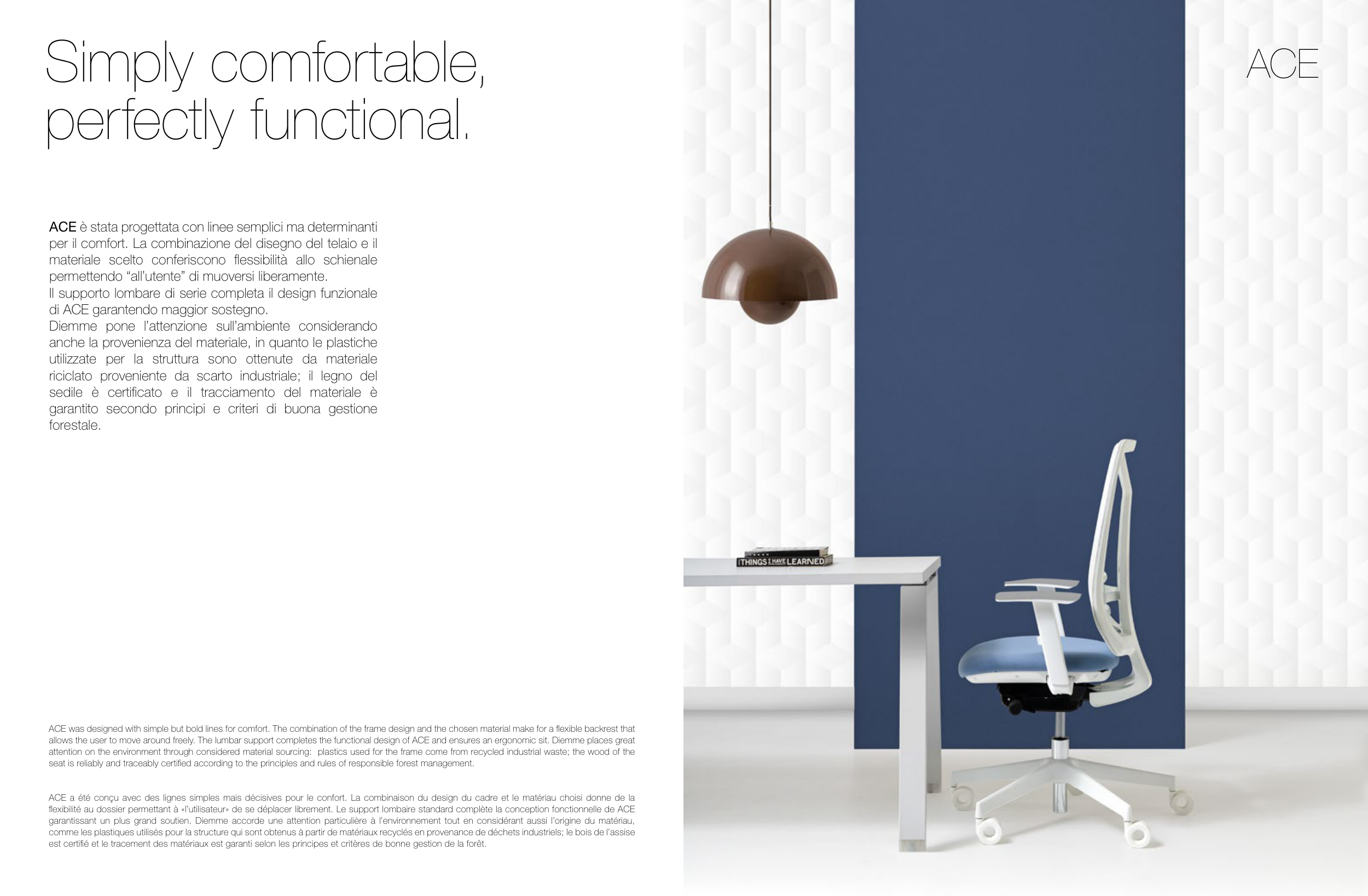 ACE was designed with simple but bold lines for comfort. The combination of the frame design and the chosen material make for a flexible backrest that