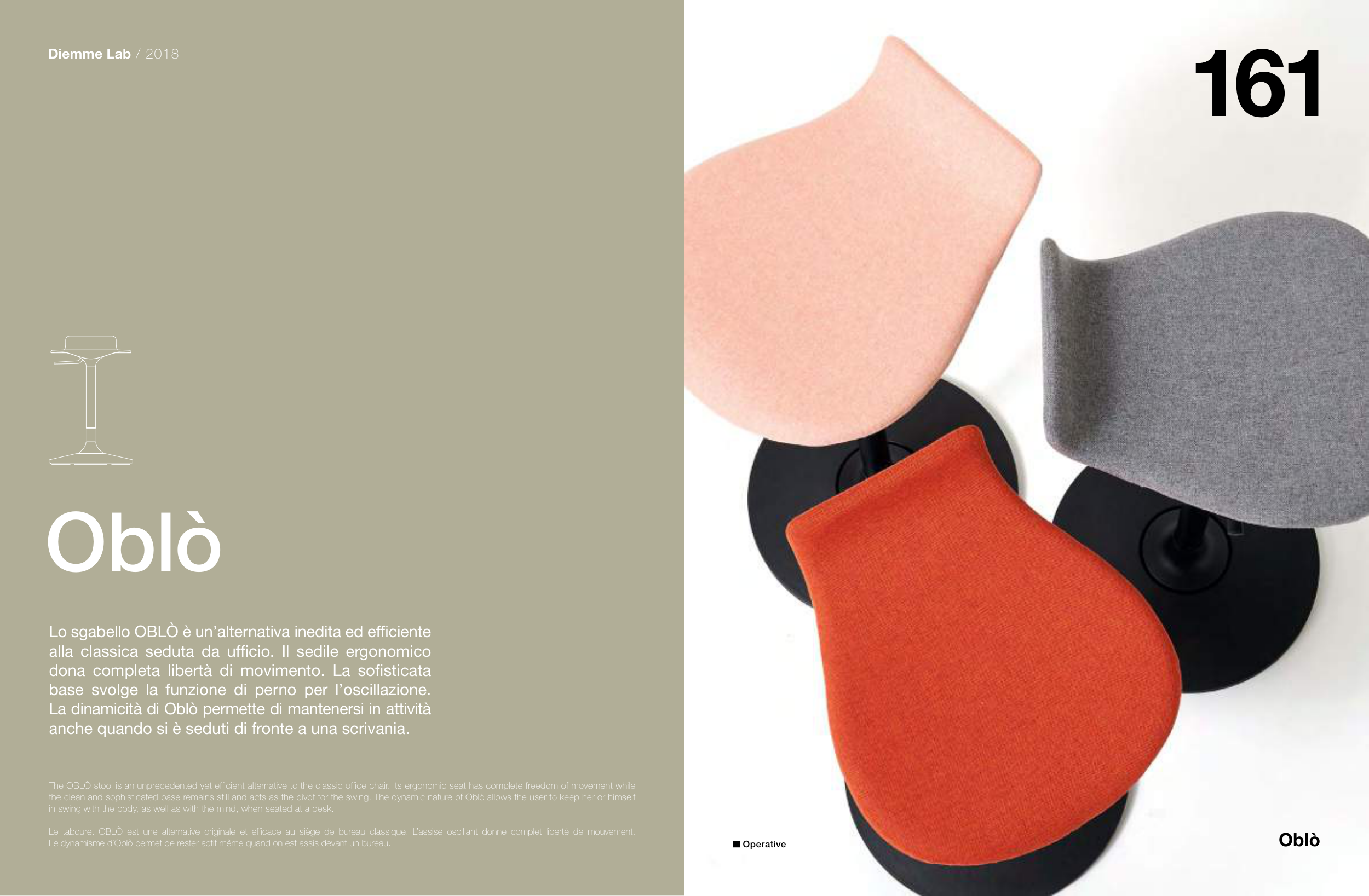 Le tabouret OBLÒ est une alternative originale et efficace au siège de bureau classique. L’assise oscillant donne complet liberté de mouvement.