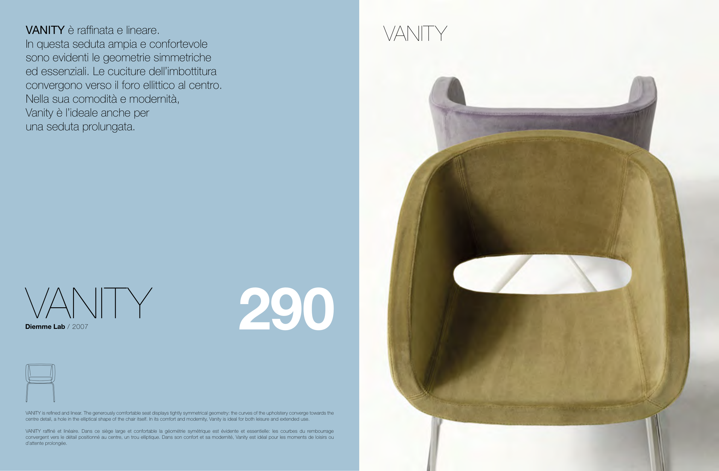 VANITY is refined and linear. The generously comfortable seat displays tightly symmetrical geometry: the curves of the upholstery converge towards the