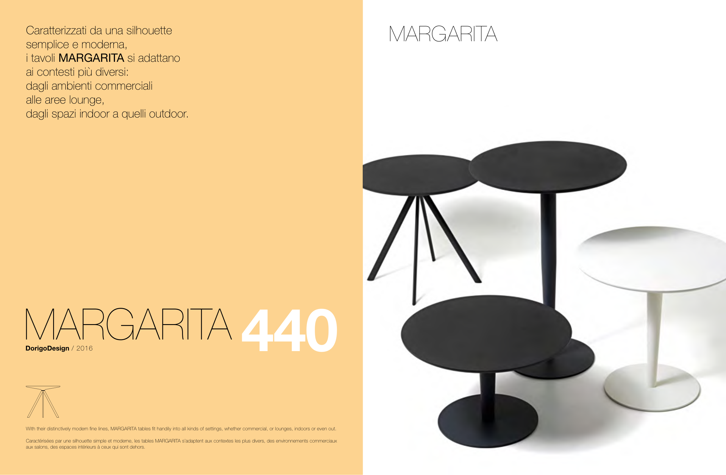 Caractérisées par une silhouette simple et moderne, les tables MARGARITA s’adaptent aux contextes les plus divers, des environnements commerciaux