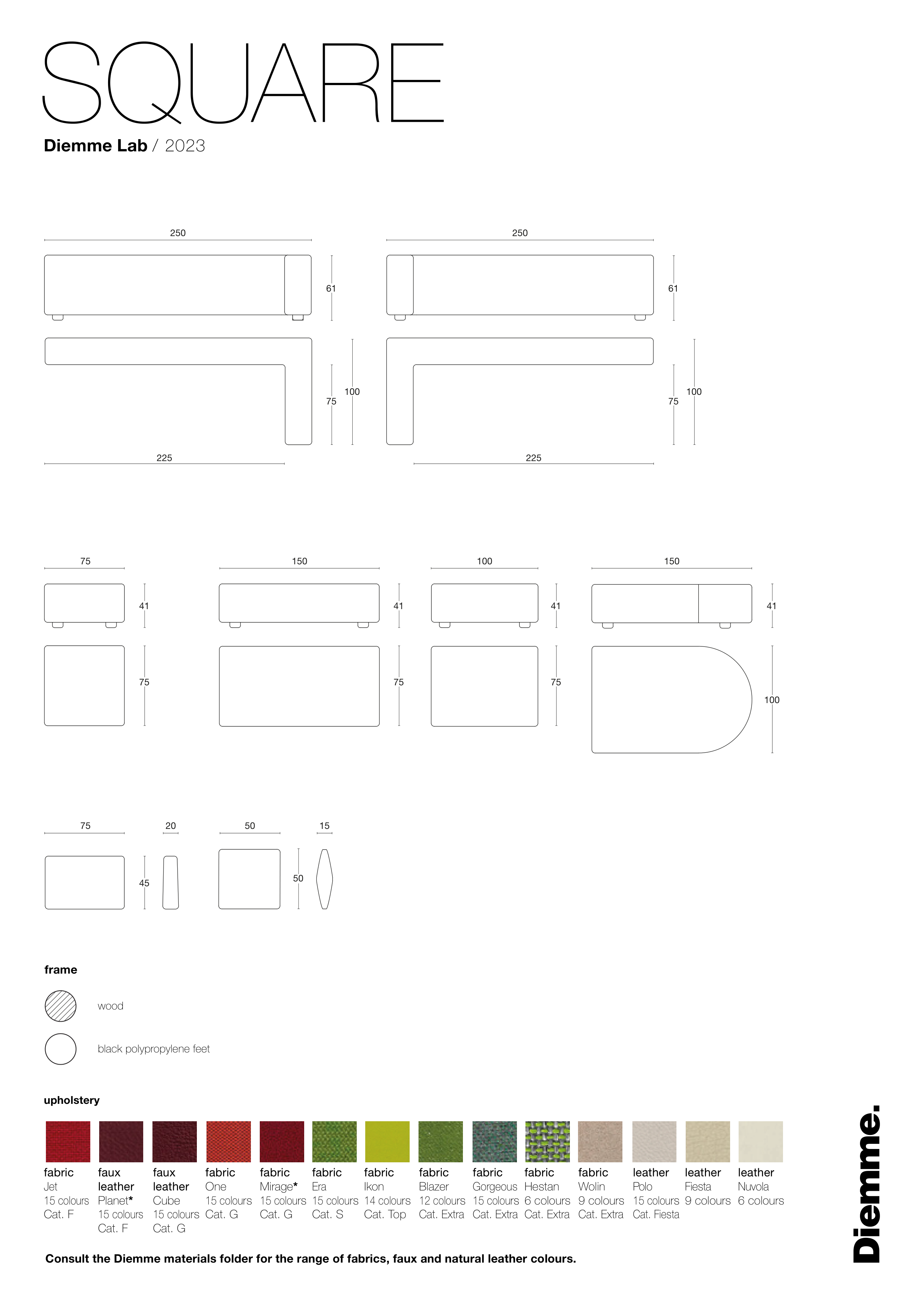 Consult the Diemme materials folder for the range of fabrics, faux and natural leather colours.