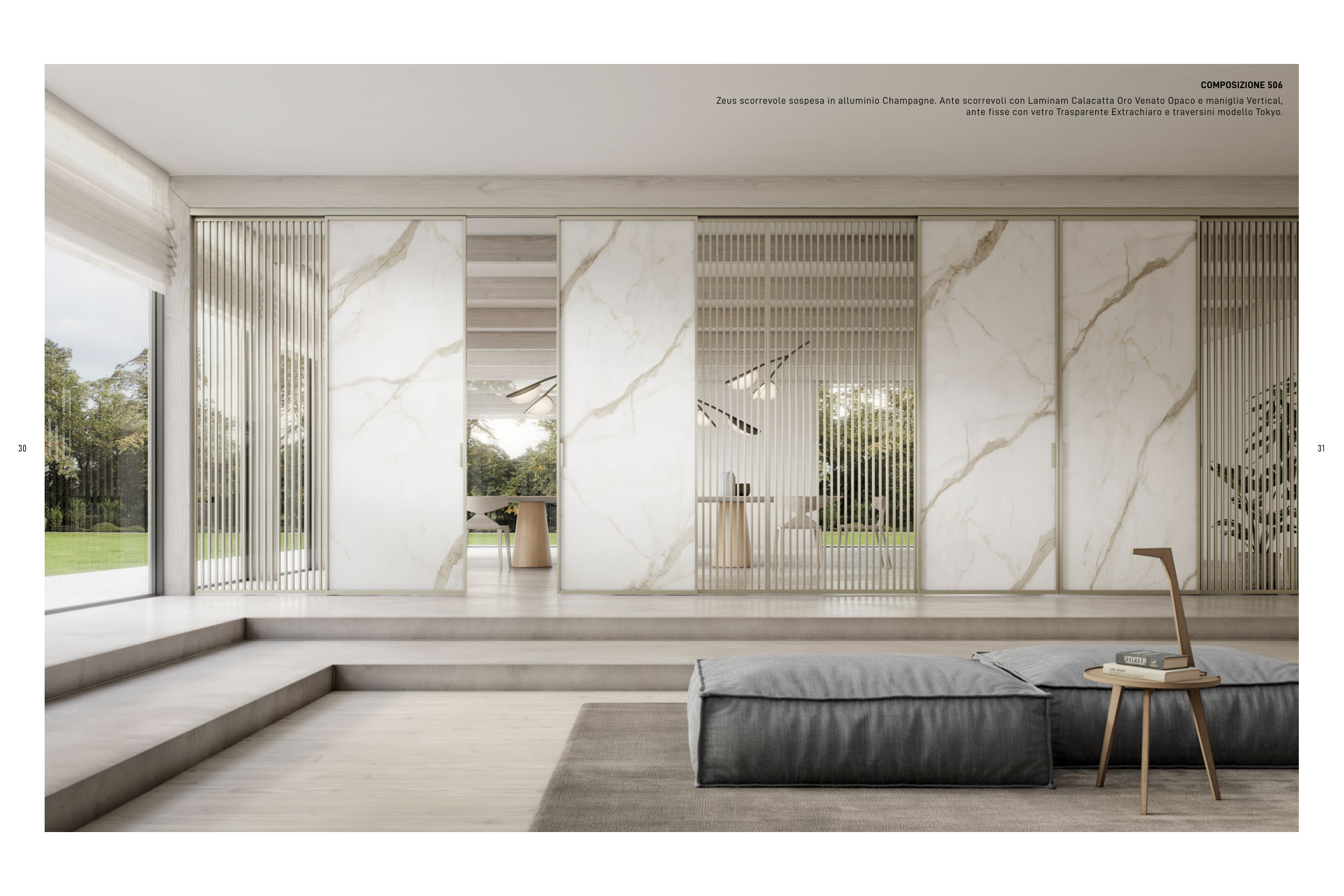 Zeus scorrevole sospesa in alluminio Champagne. Ante scorrevoli con Laminam Calacatta Oro Venato Opaco e maniglia Vertical,