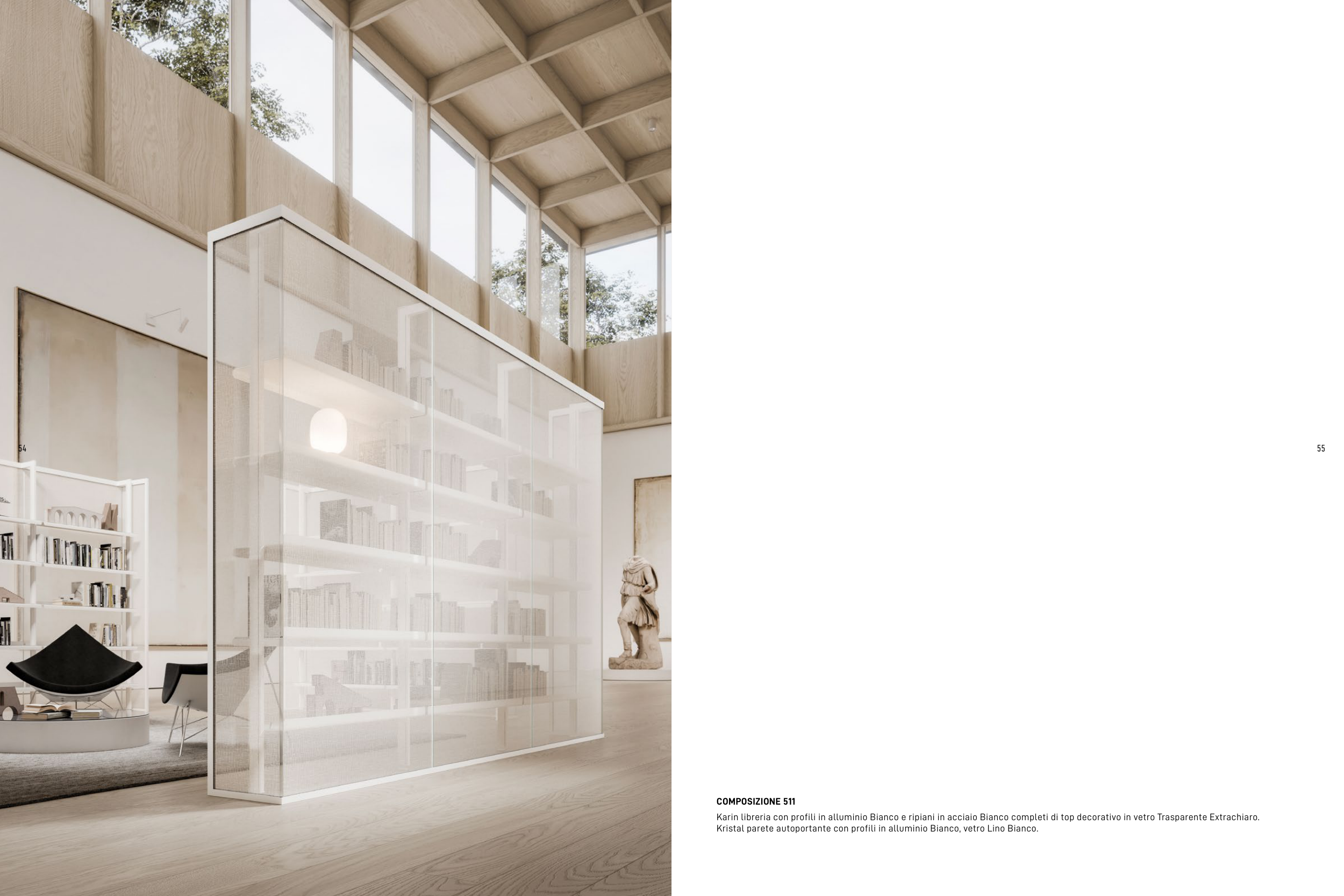 Karin libreria con profili in alluminio Bianco e ripiani in acciaio Bianco completi di top decorativo in vetro Trasparente Extrachiaro.