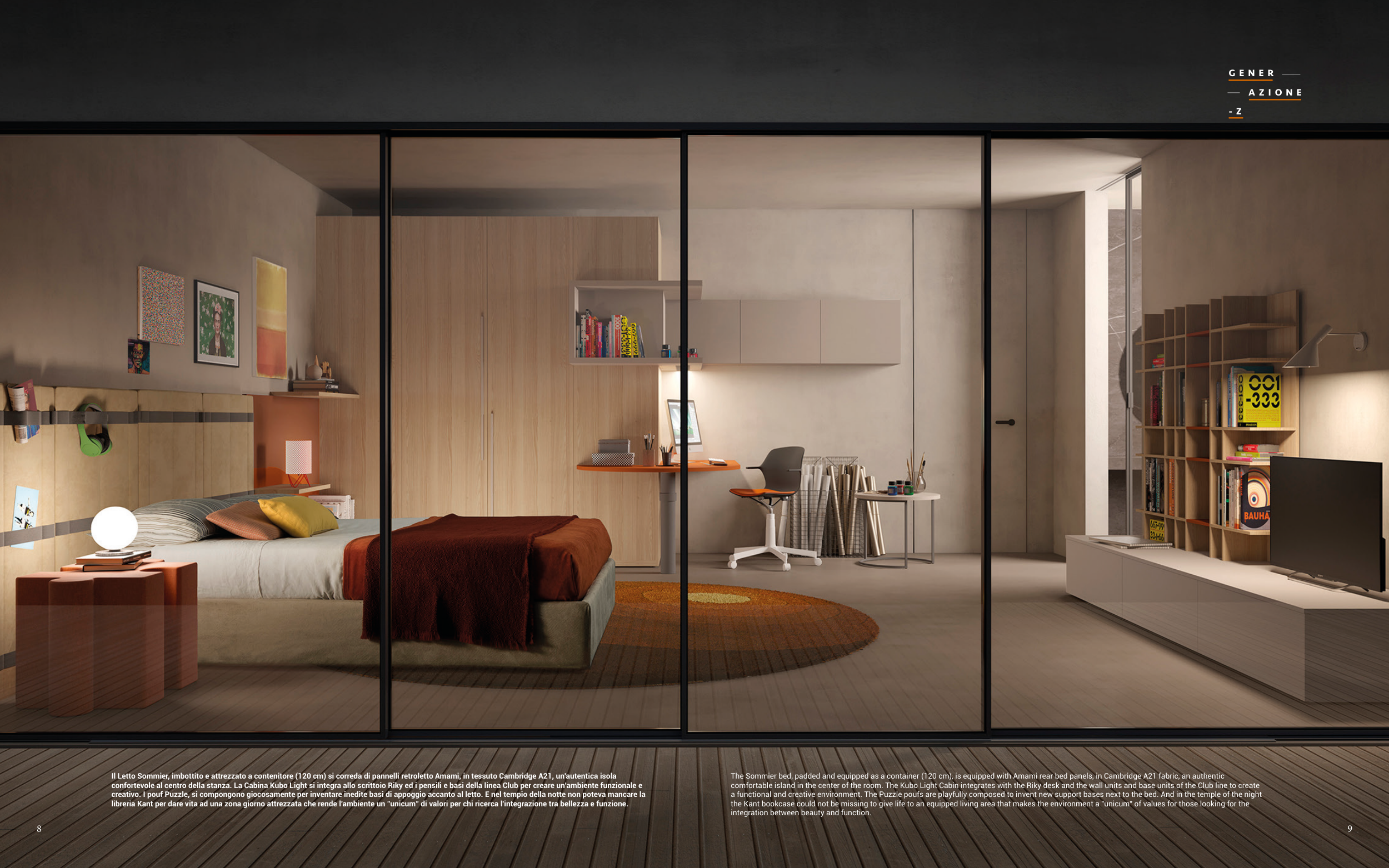 confortevole al centro della stanza. La Cabina Kubo Light si integra allo scrittoio Riky ed i pensili e basi della linea Club per creare un'ambiente funzionale e