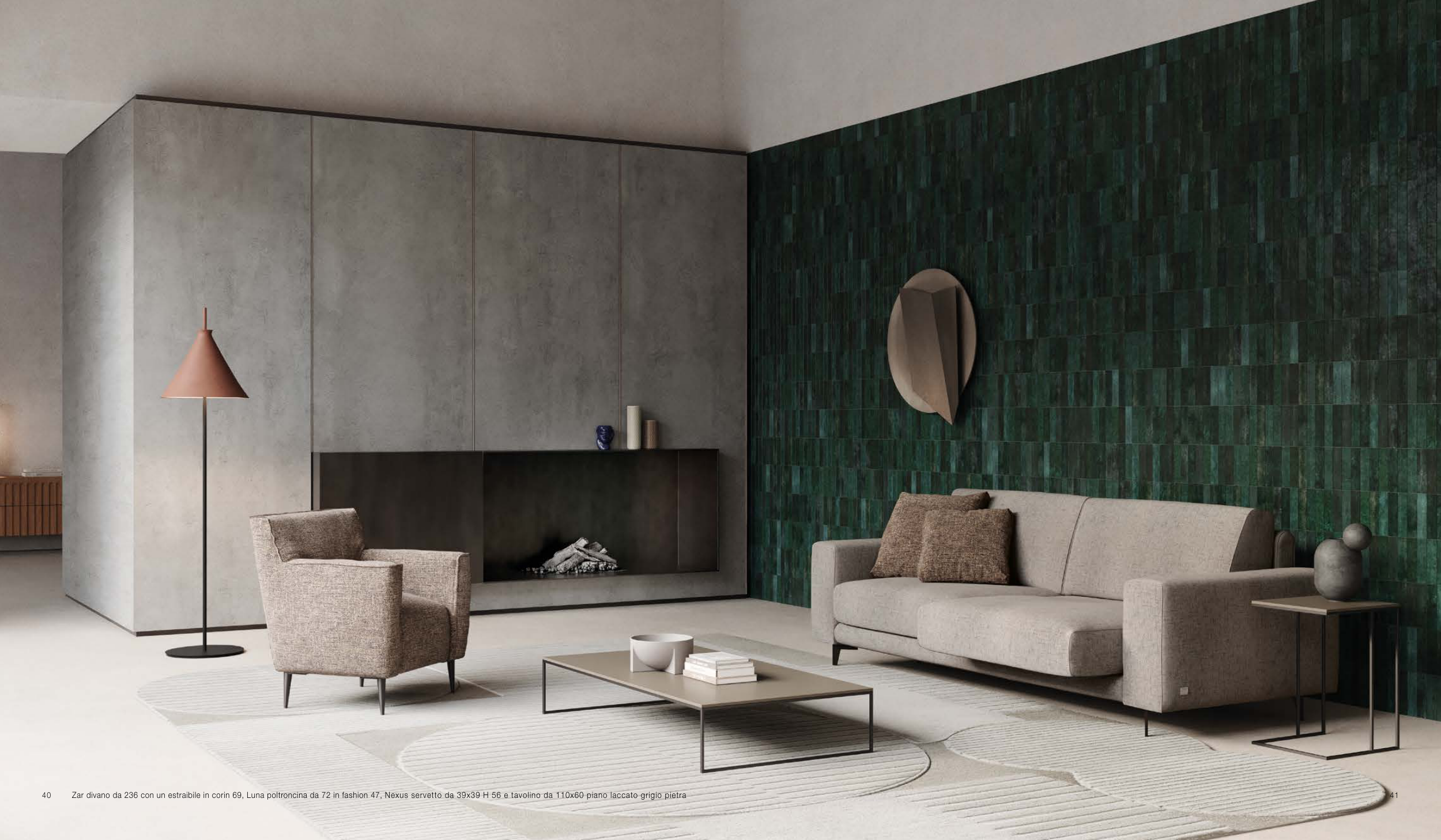Zar divano da 236 con un estraibile in corin 69, Luna poltroncina da 72 in fashion 47, Nexus servetto da 39x39 H 56 e tavolino da 110x60 piano laccato grigio pietra