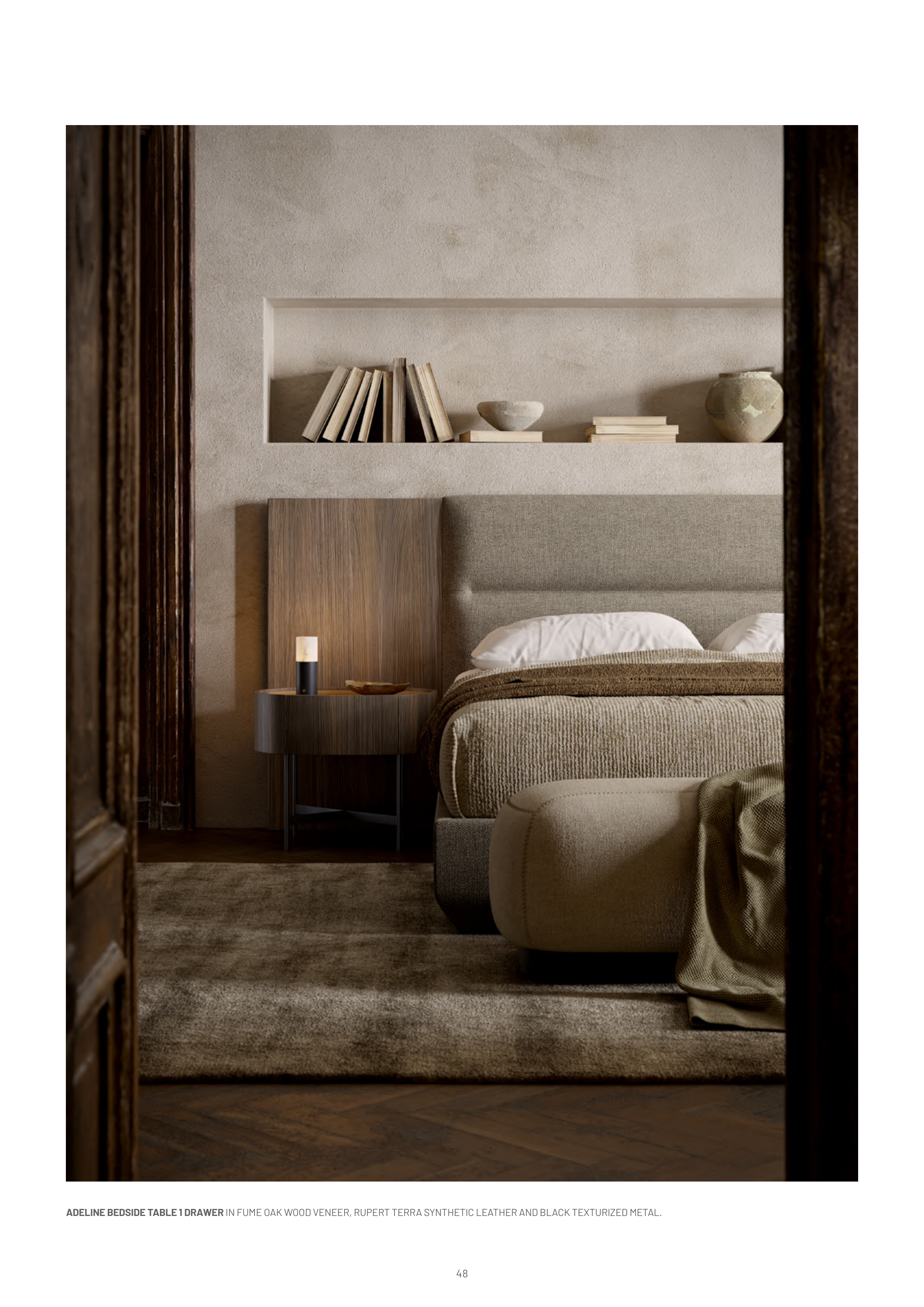 ADELINE BEDSIDE TABLE 1 DRAWER IN FUME OAK WOOD VENEER, RUPERT TERRA SYNTHETIC LEATHER AND BLACK TEXTURIZED METAL.