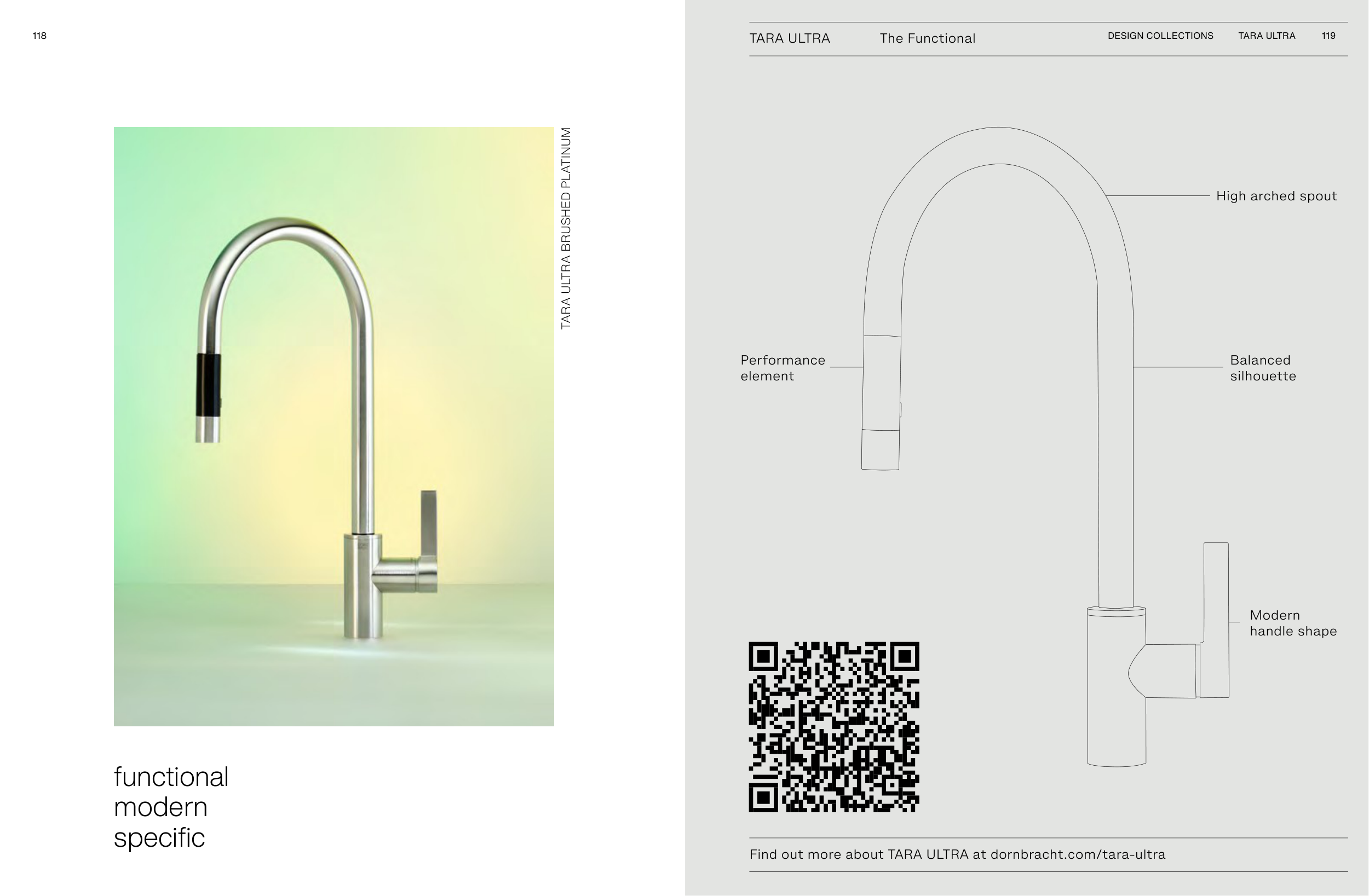 118 119 TARA ULTRA DESIGN COLLECTIONS TARA ULTRA BRUSHED PLATINUM Modern handle shape High arched spout Balanced silhouette Performance element functional modern specific Find out more about TARA ULTRA at dornbracht.com/tara-ultra TARA ULTRA The Functional