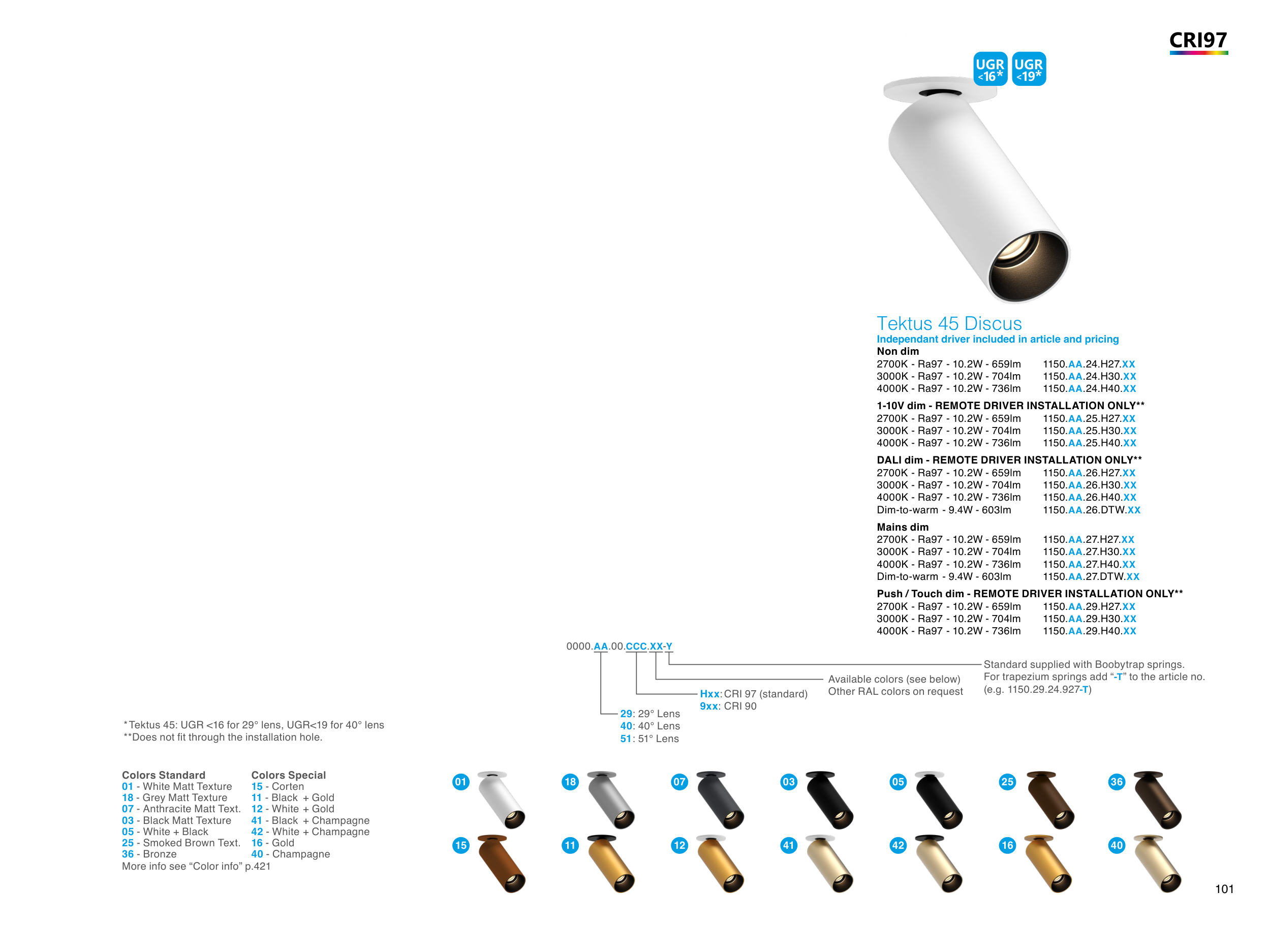 * Tektus 45: UGR <16 for 29° lens, UGR<19 for 40° lens