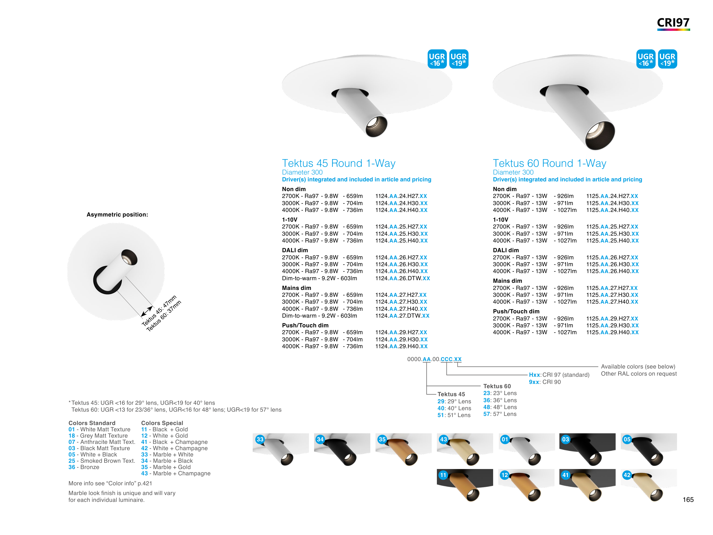 Tektus 60: UGR <13 for 23/36° lens, UGR<16 for 48° lens; UGR<19 for 57° lens