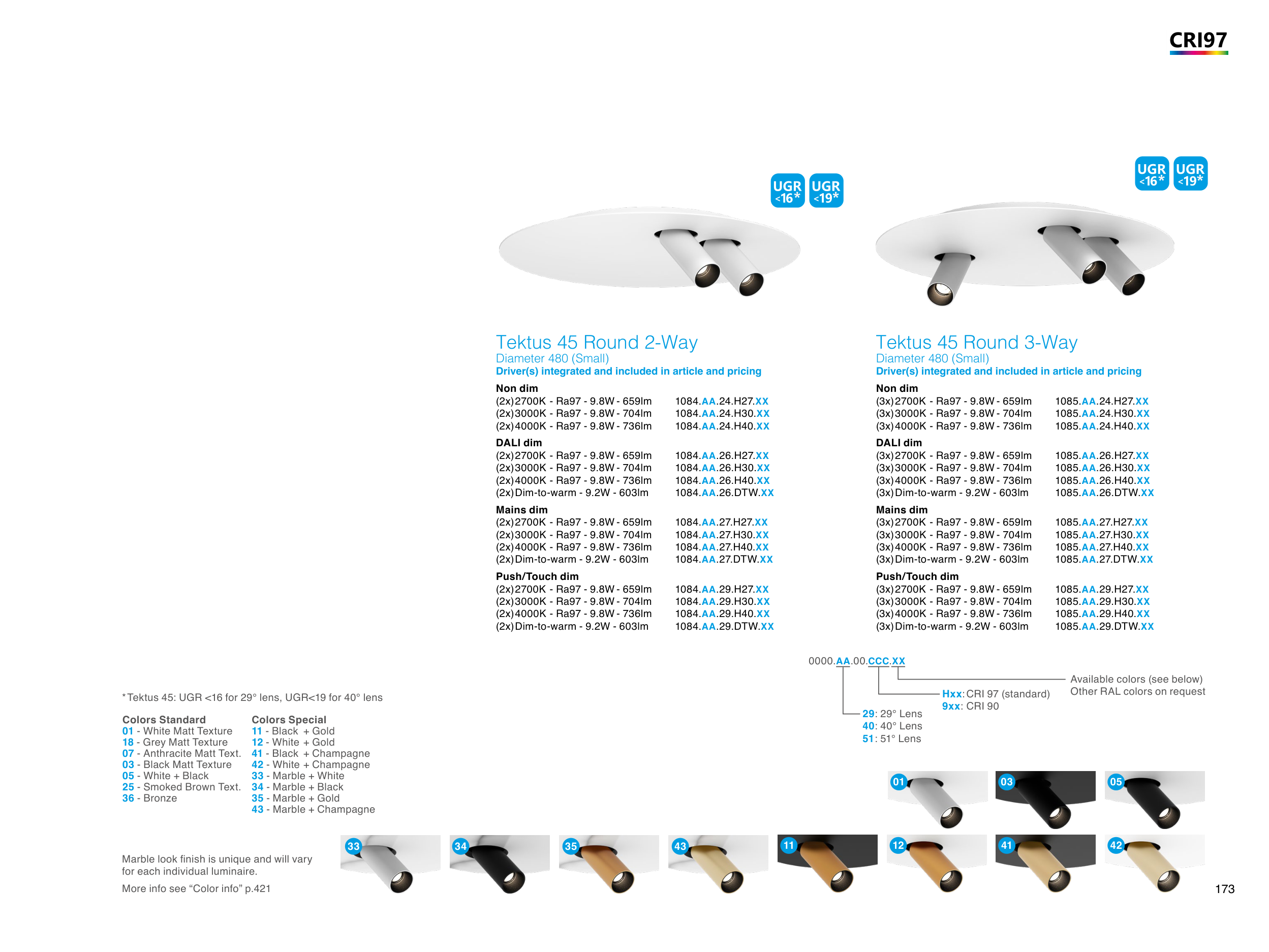 * Tektus 45: UGR <16 for 29° lens, UGR<19 for 40° lens