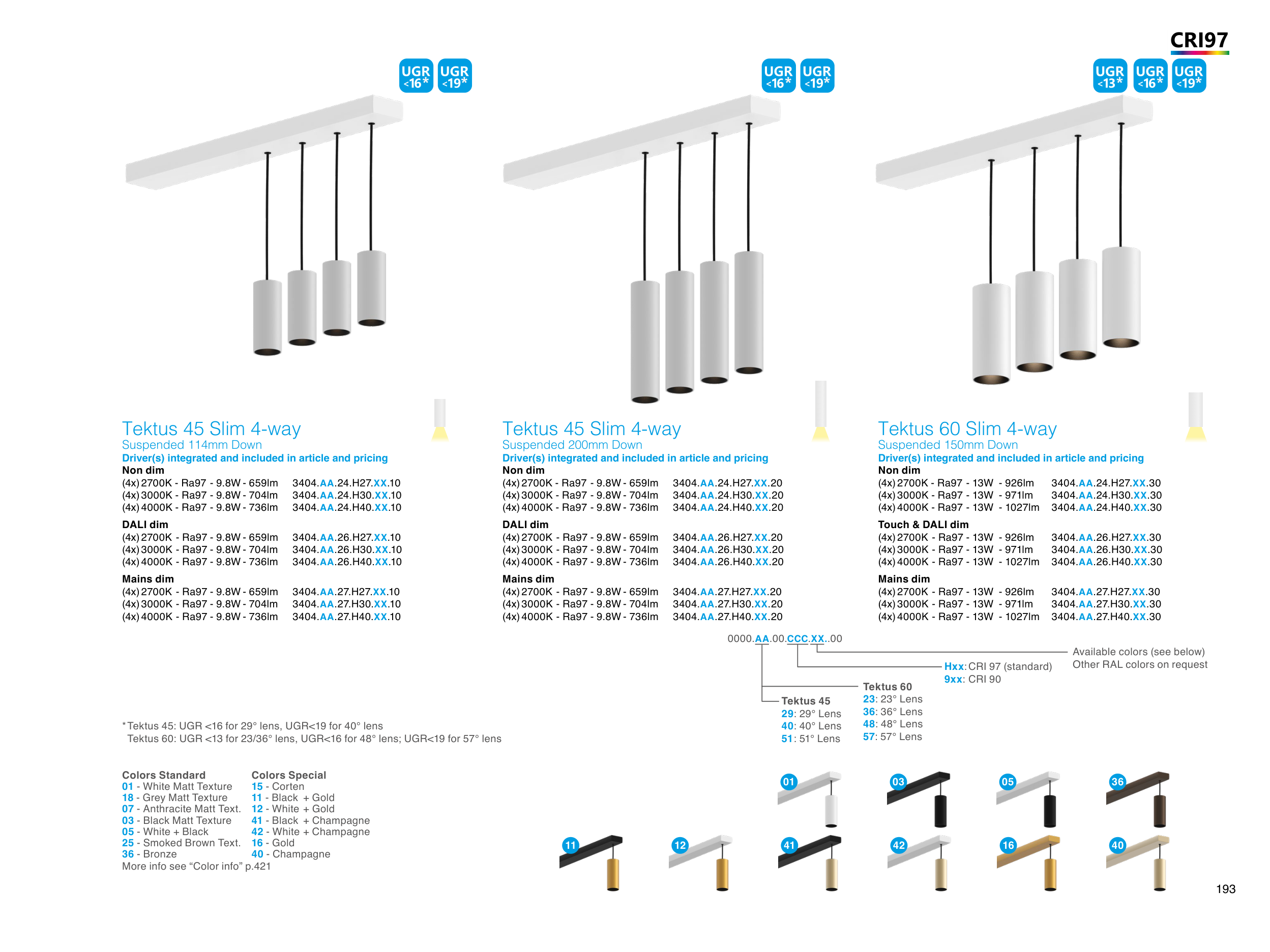 Tektus 60: UGR <13 for 23/36° lens, UGR<16 for 48° lens; UGR<19 for 57° lens
