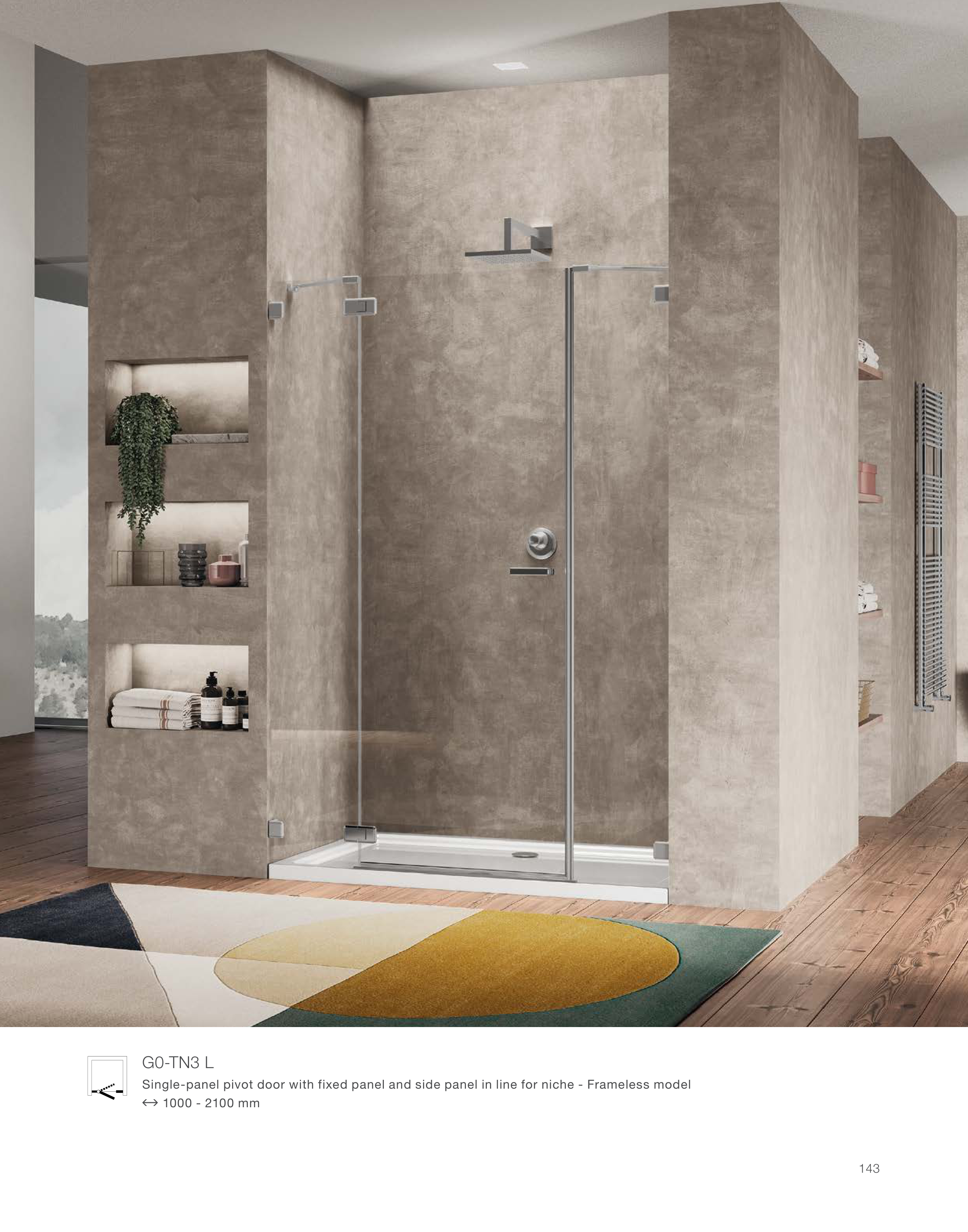 Single-panel pivot door with fixed panel and side panel in line for niche - Frameless model