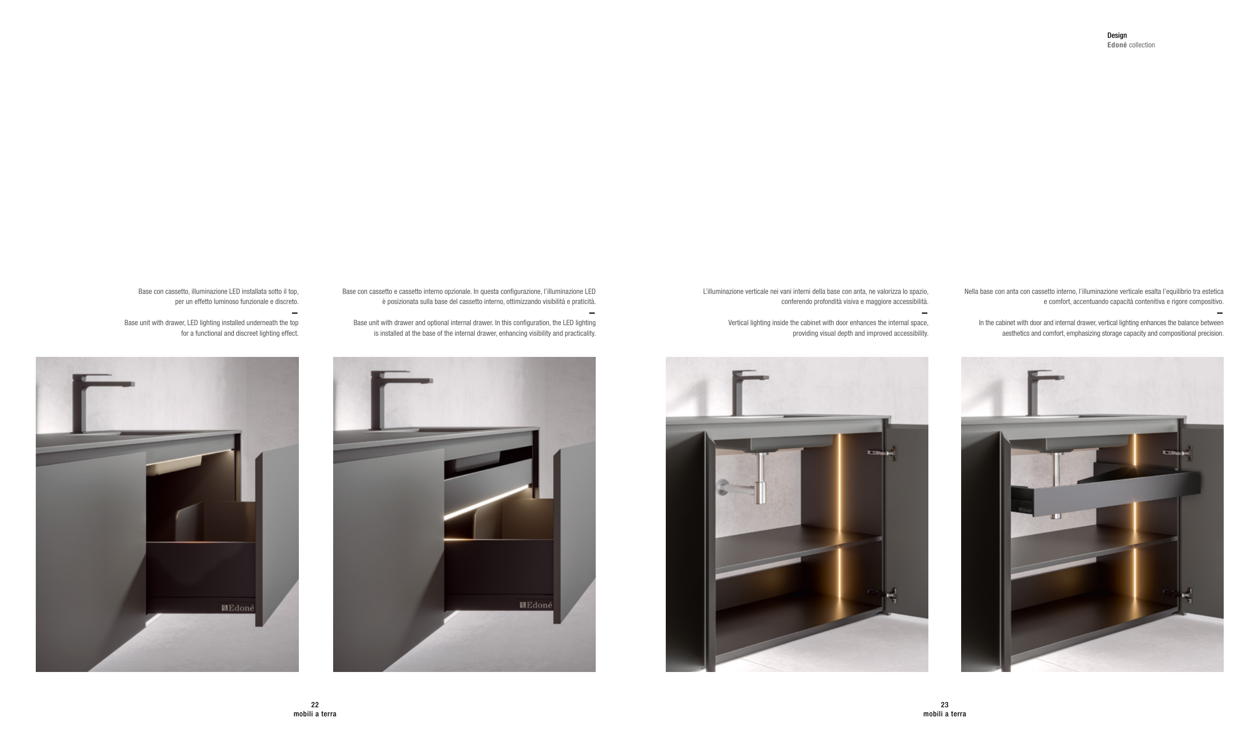 Nella base con anta con cassetto interno, l’illuminazione verticale esalta l’equilibrio tra estetica