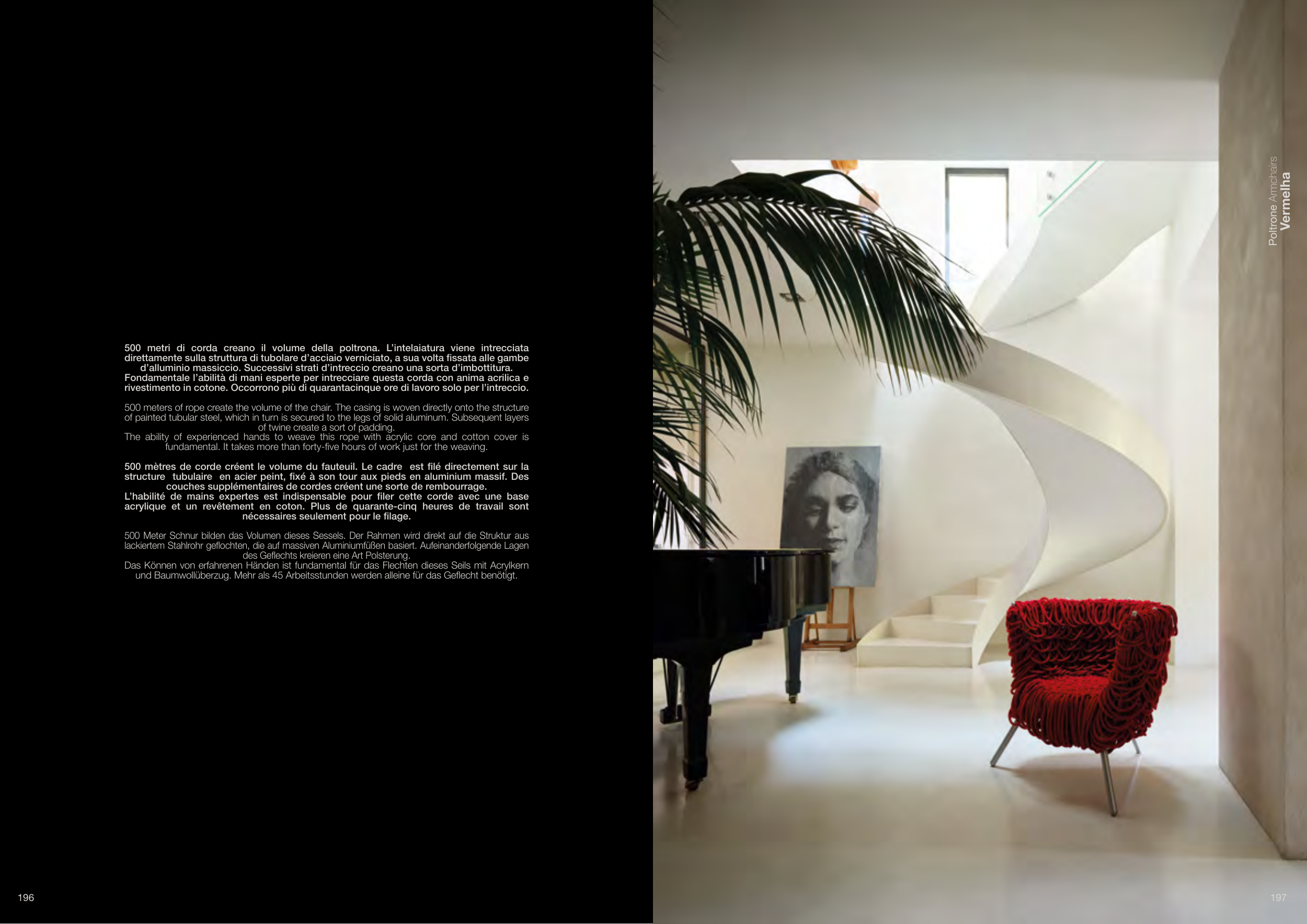 500 metri di corda creano il volume della poltrona. L’intelaiatura viene intrecciata