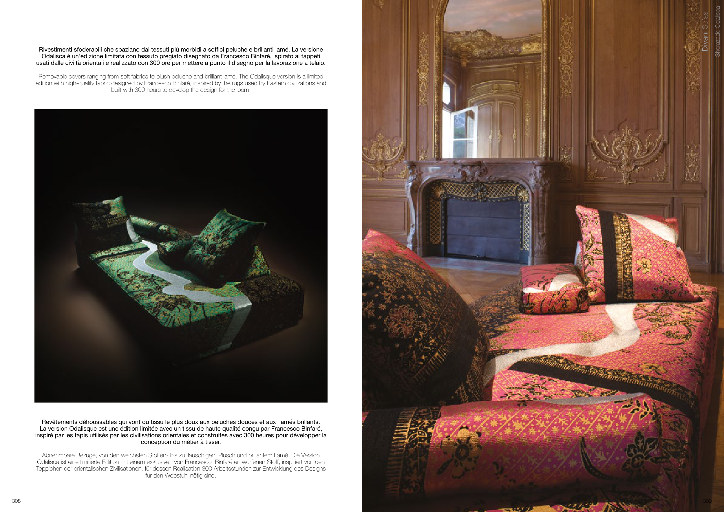 Removable covers ranging from soft fabrics to plush peluche and brilliant lamé. The Odalisque version is a limited