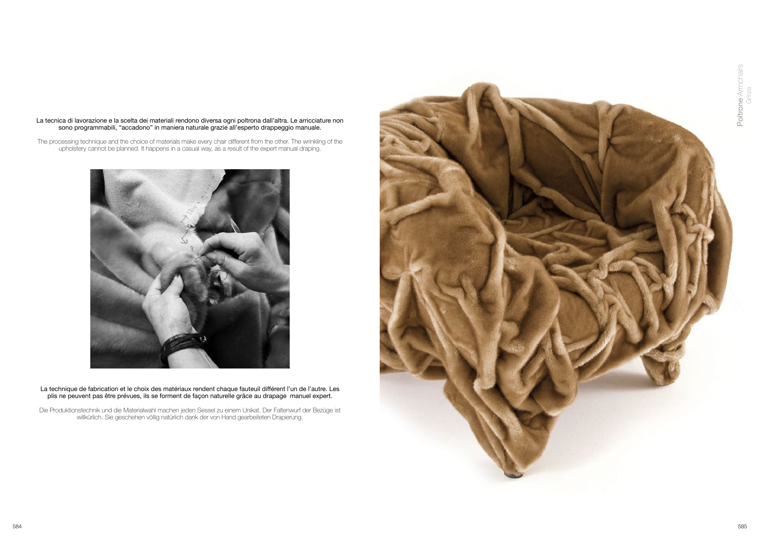 Die Produktionstechnik und die Materialwahl machen jeden Sessel zu einem Unikat. Der Faltenwurf der Bezüge ist