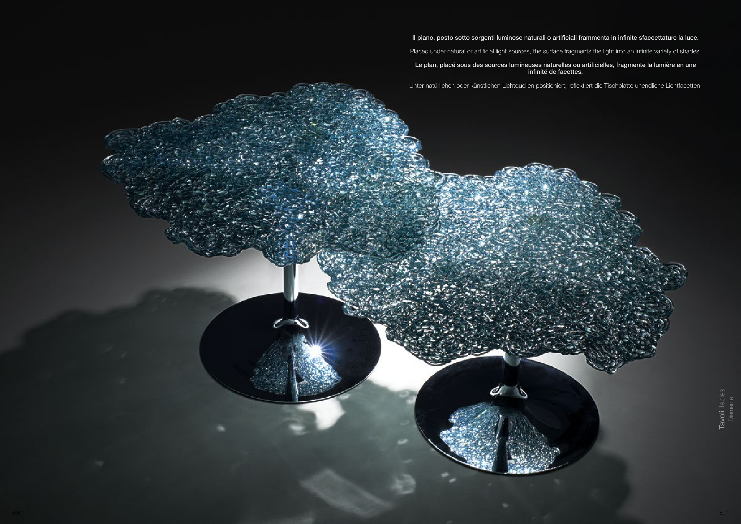 Placed under natural or artificial light sources, the surface fragments the light into an infinite variety of shades.