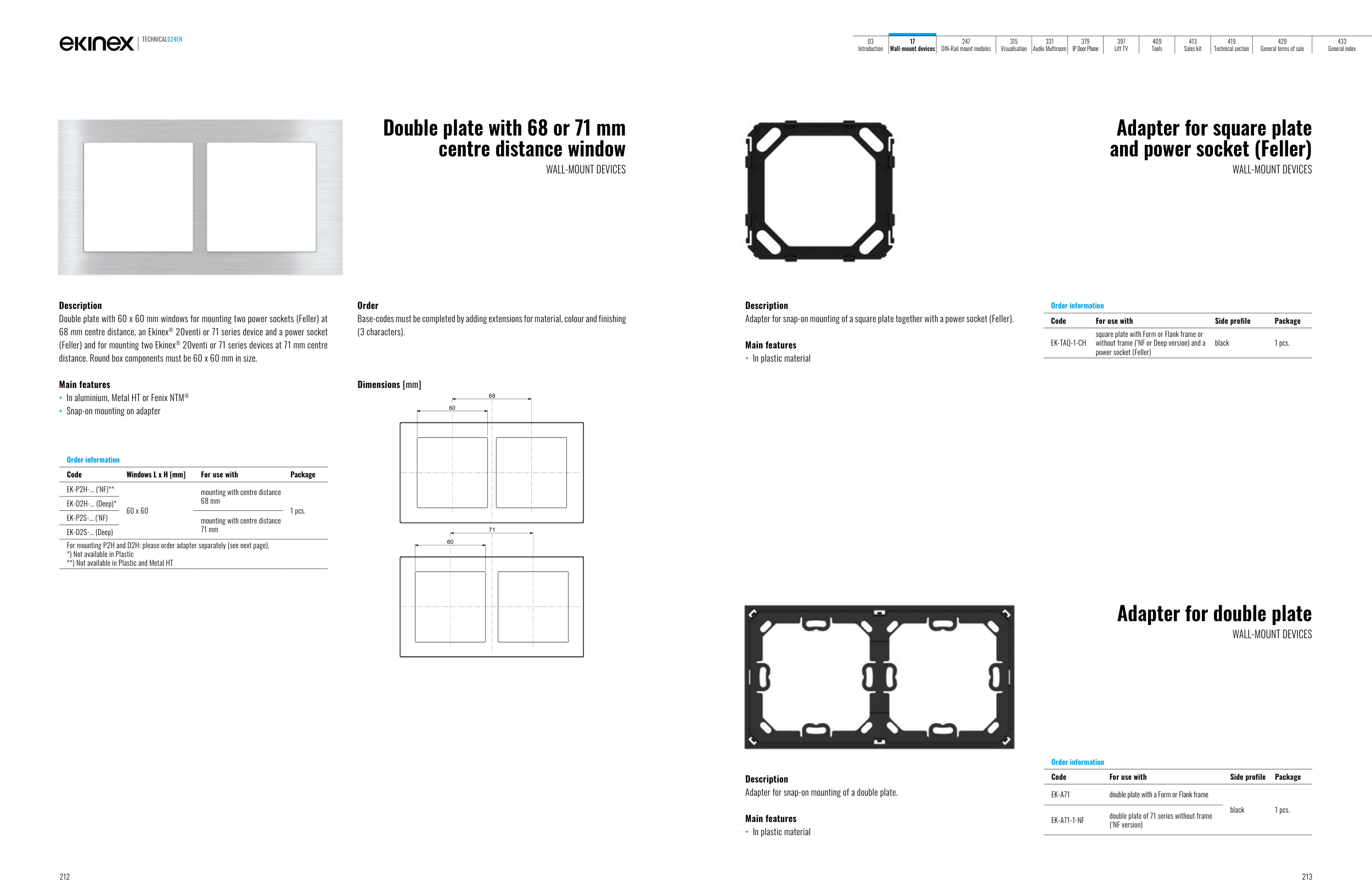 (Feller) and for mounting two Ekinex® 20venti or 71 series devices at 71 mm centre