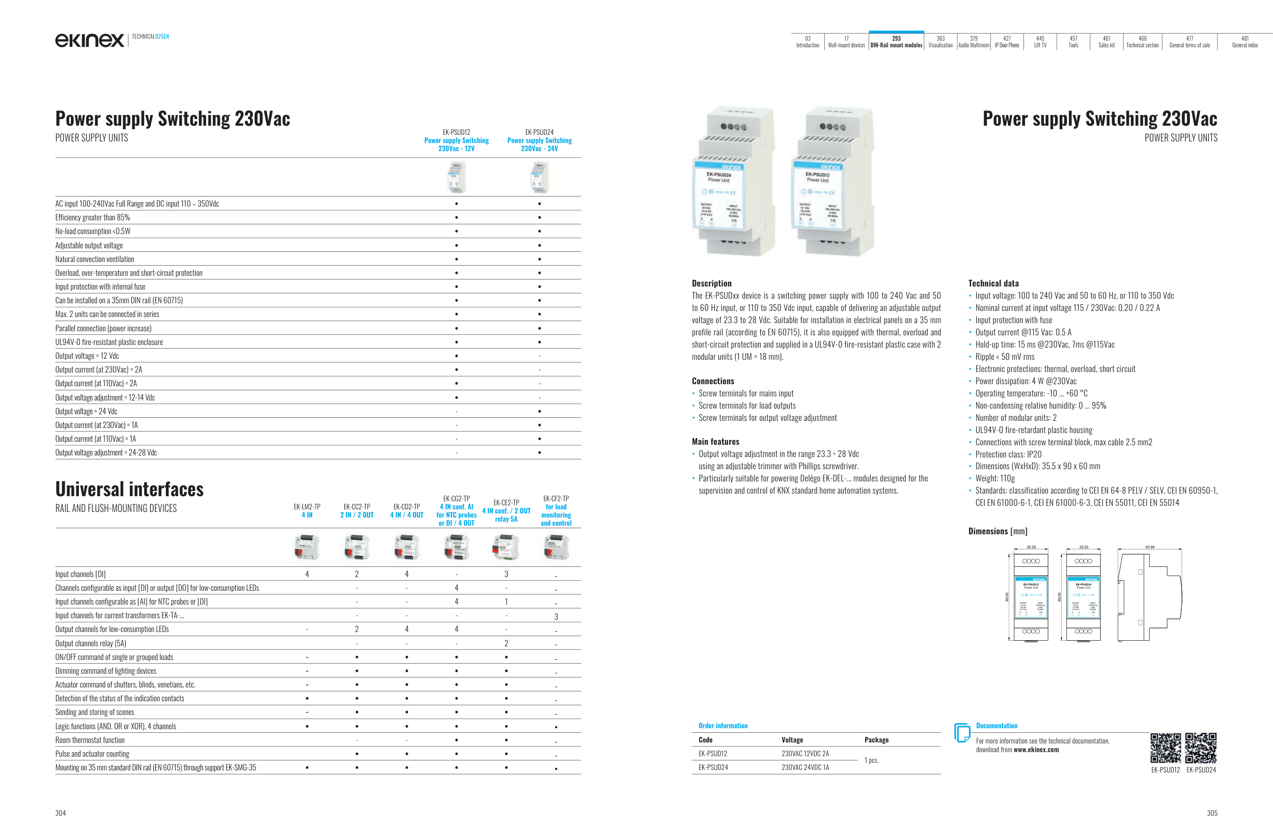 The EK-PSUDxx device is a switching power supply with 100 to 240 Vac and 50