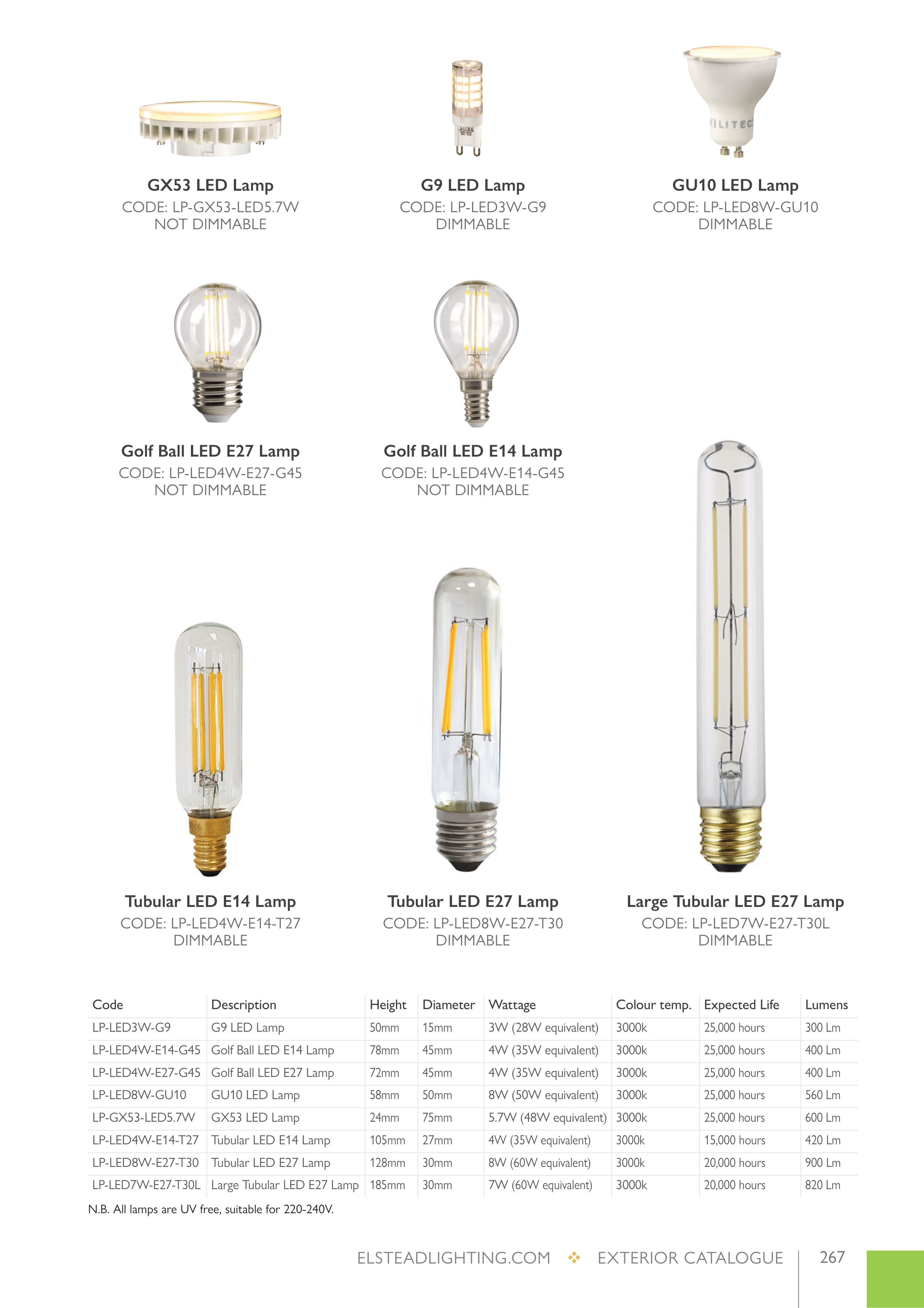 N.B. All lamps are UV free, suitable for 220-240V.