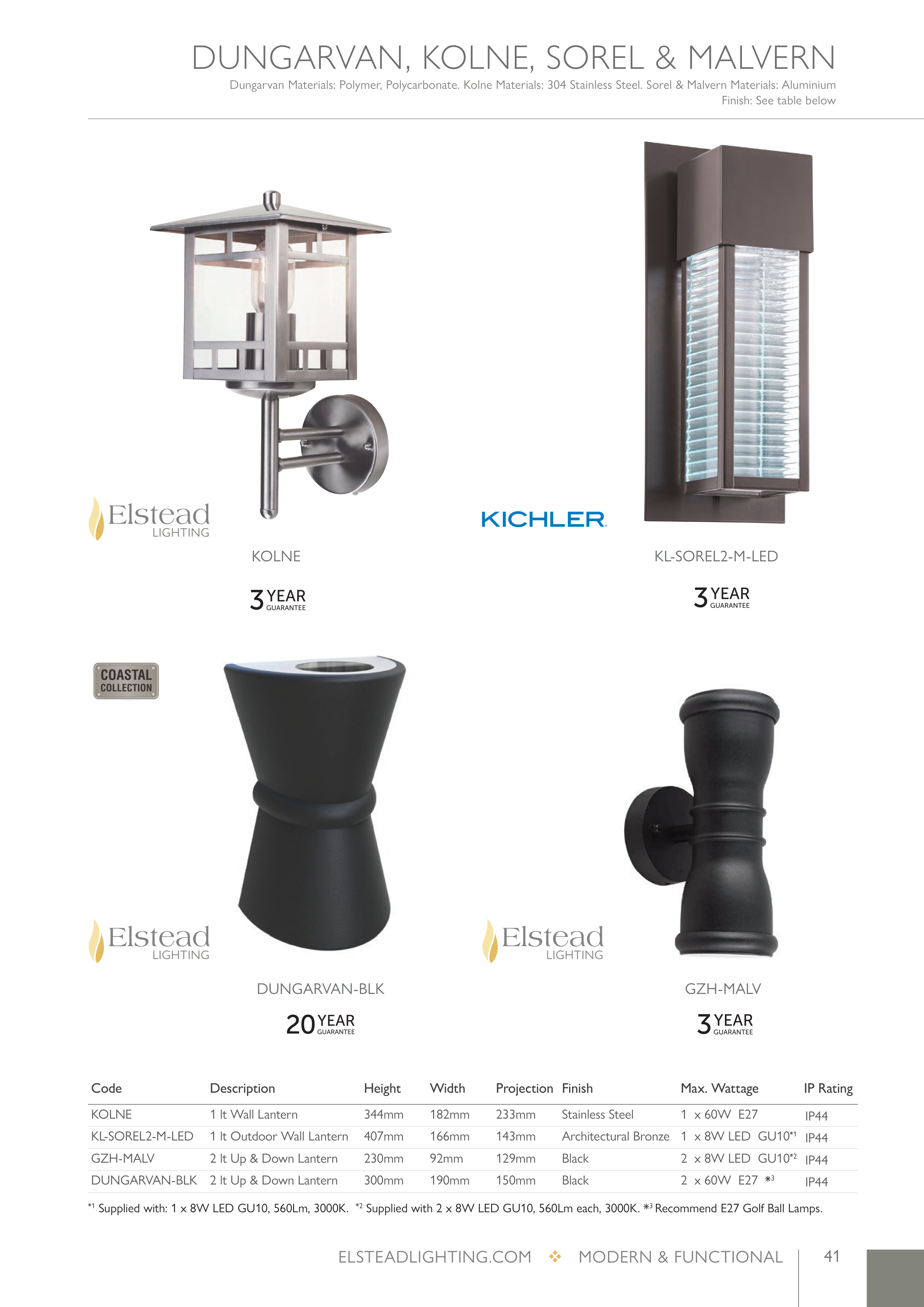 *1 Supplied with: 1 x 8W LED GU10, 560Lm, 3000K. *2 Supplied with 2 x 8W LED GU10, 560Lm each, 3000K. *3 Recommend E27 Golf Ball Lamps.