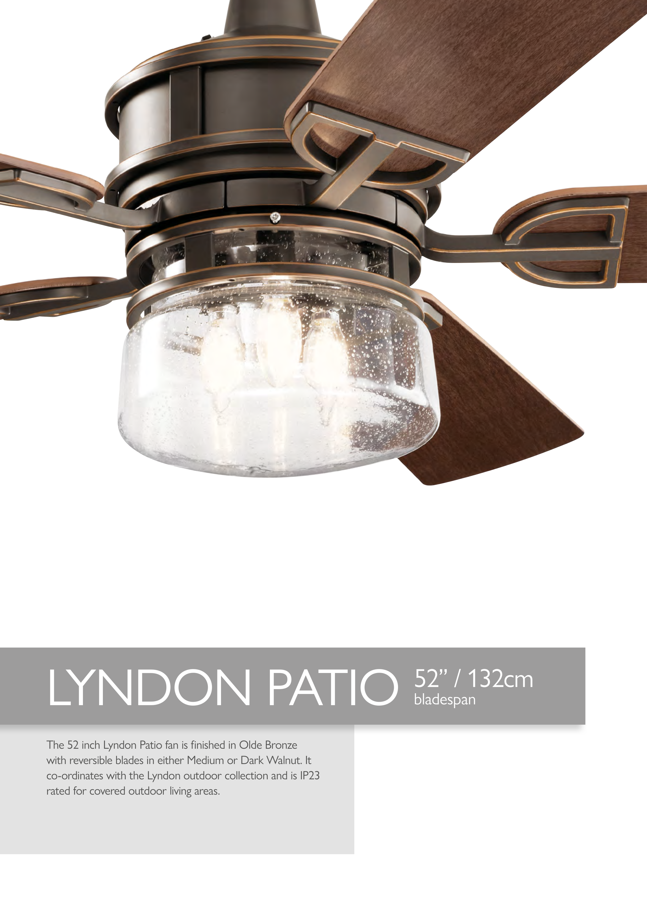 The 52 inch Lyndon Patio fan is finished in Olde Bronze