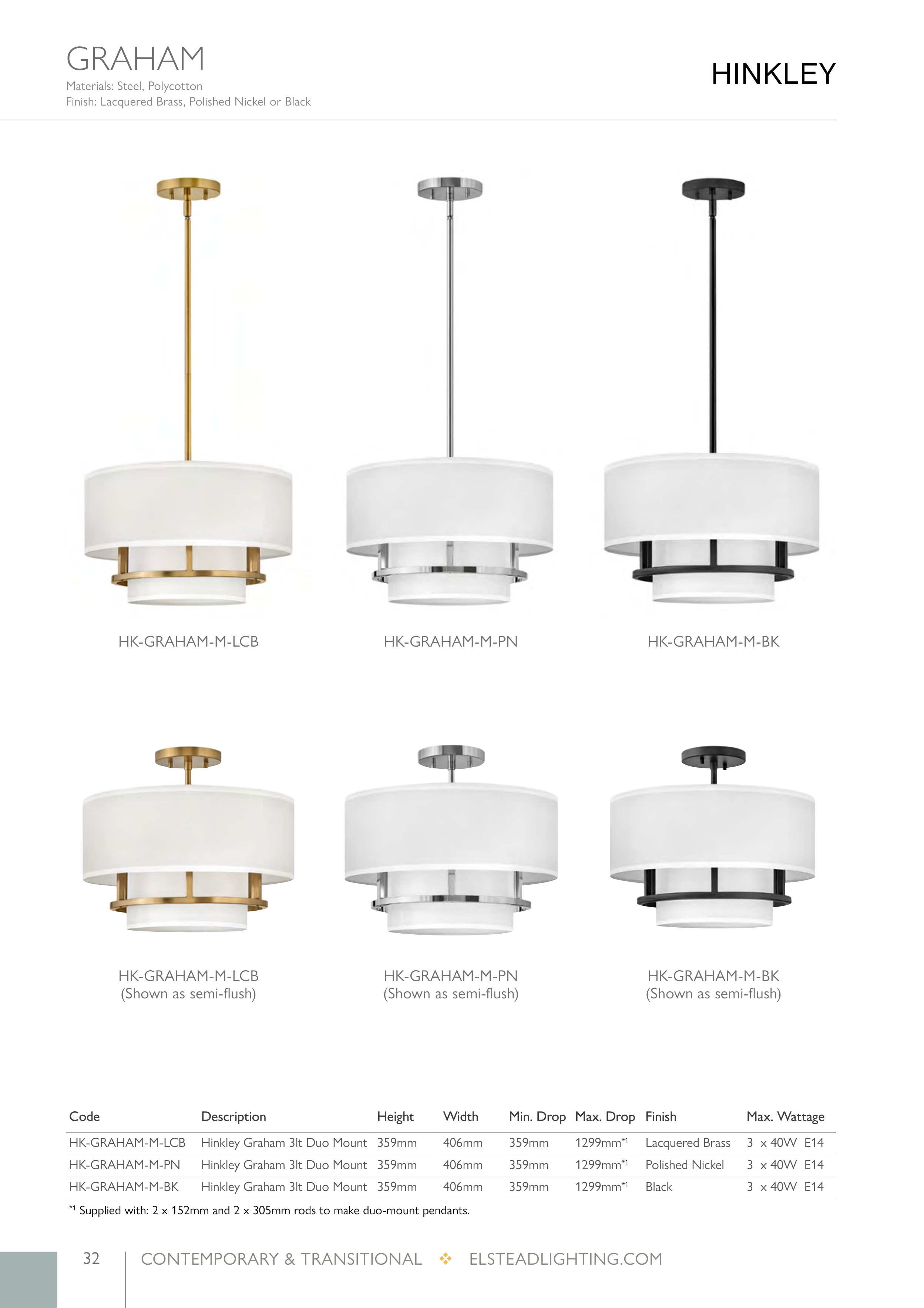 *1 Supplied with: 2 x 152mm and 2 x 305mm rods to make duo-mount pendants.