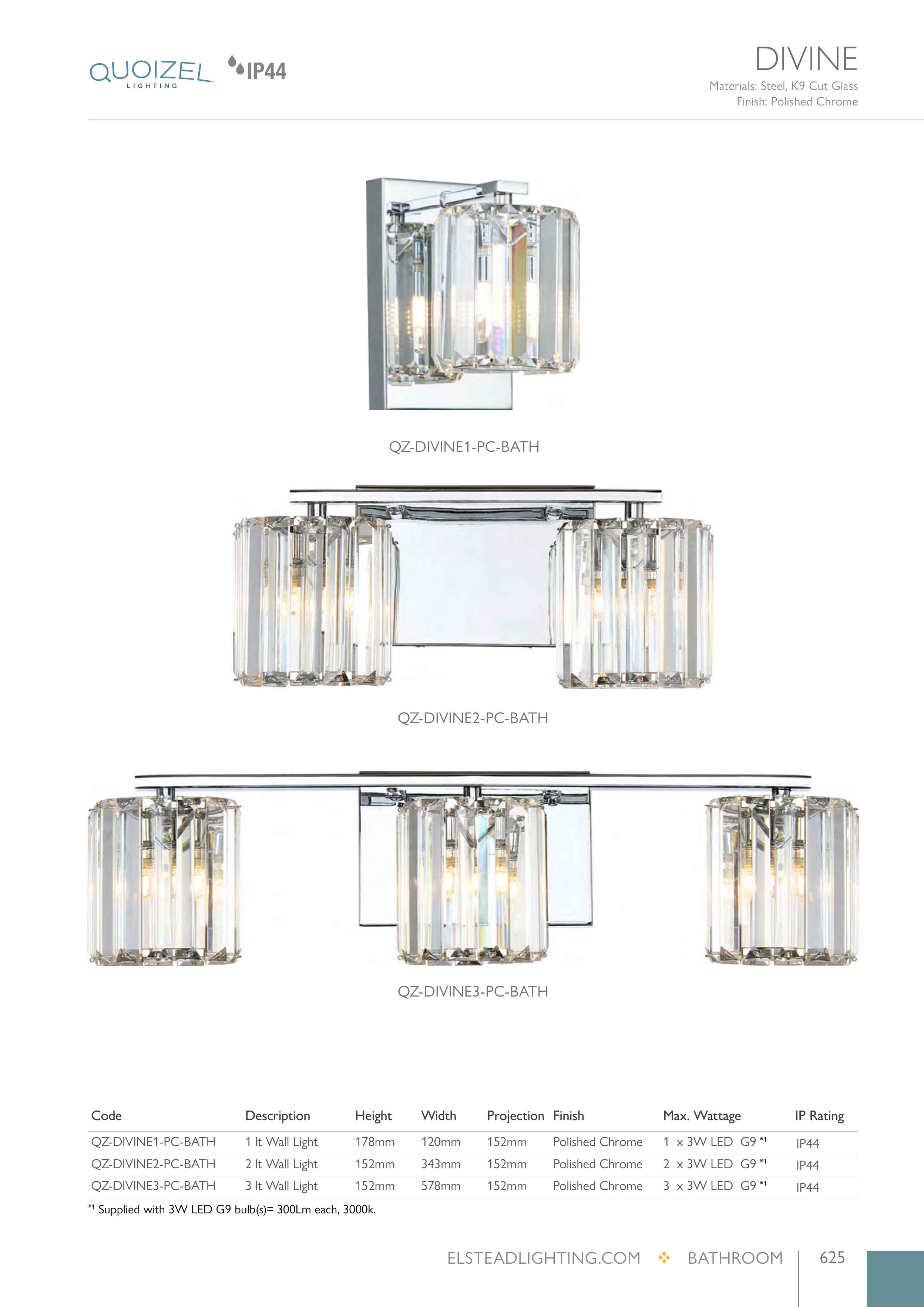 *1 Supplied with 3W LED G9 bulb(s)= 300Lm each, 3000k.