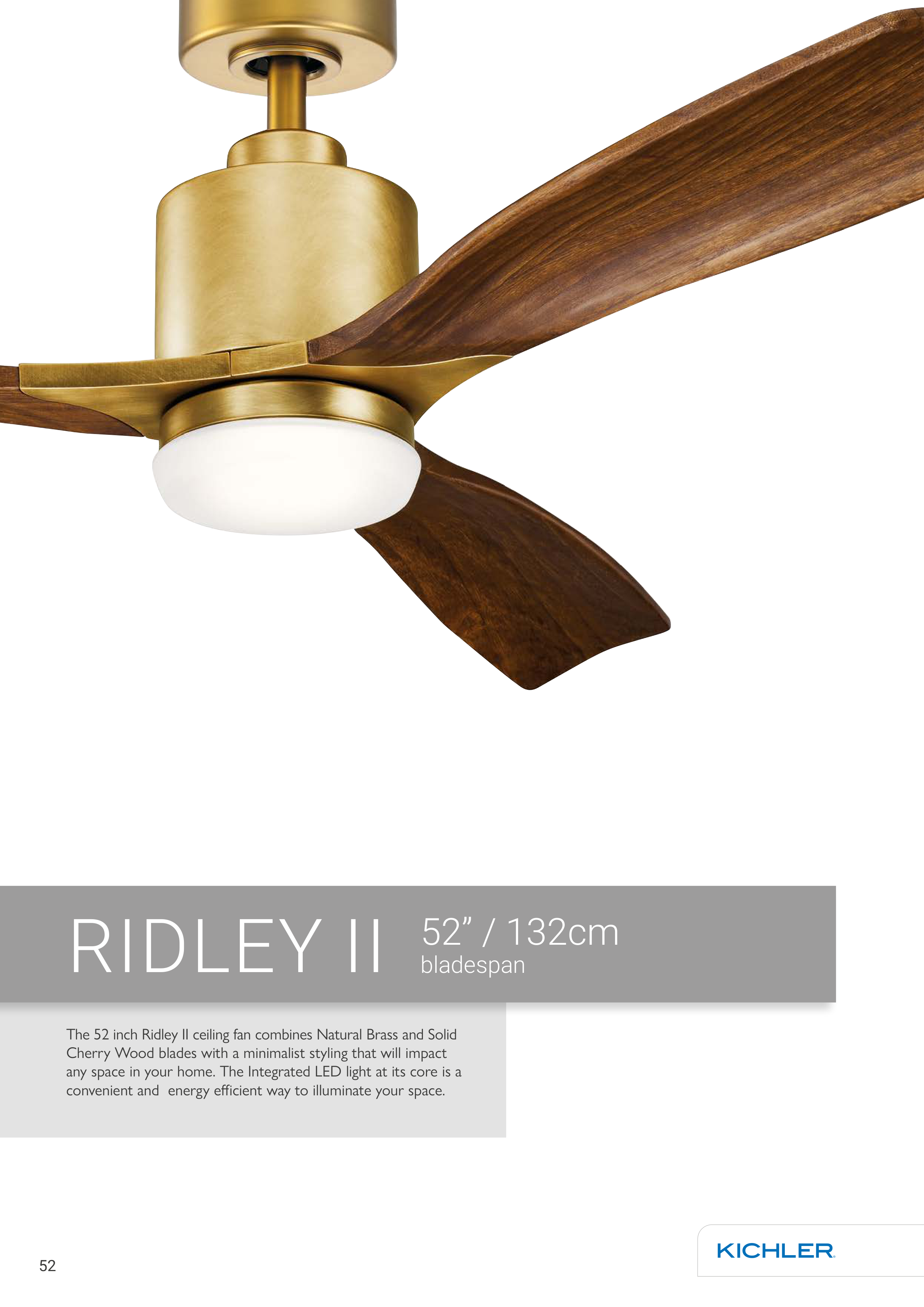 The 52 inch Ridley II ceiling fan combines Natural Brass and Solid