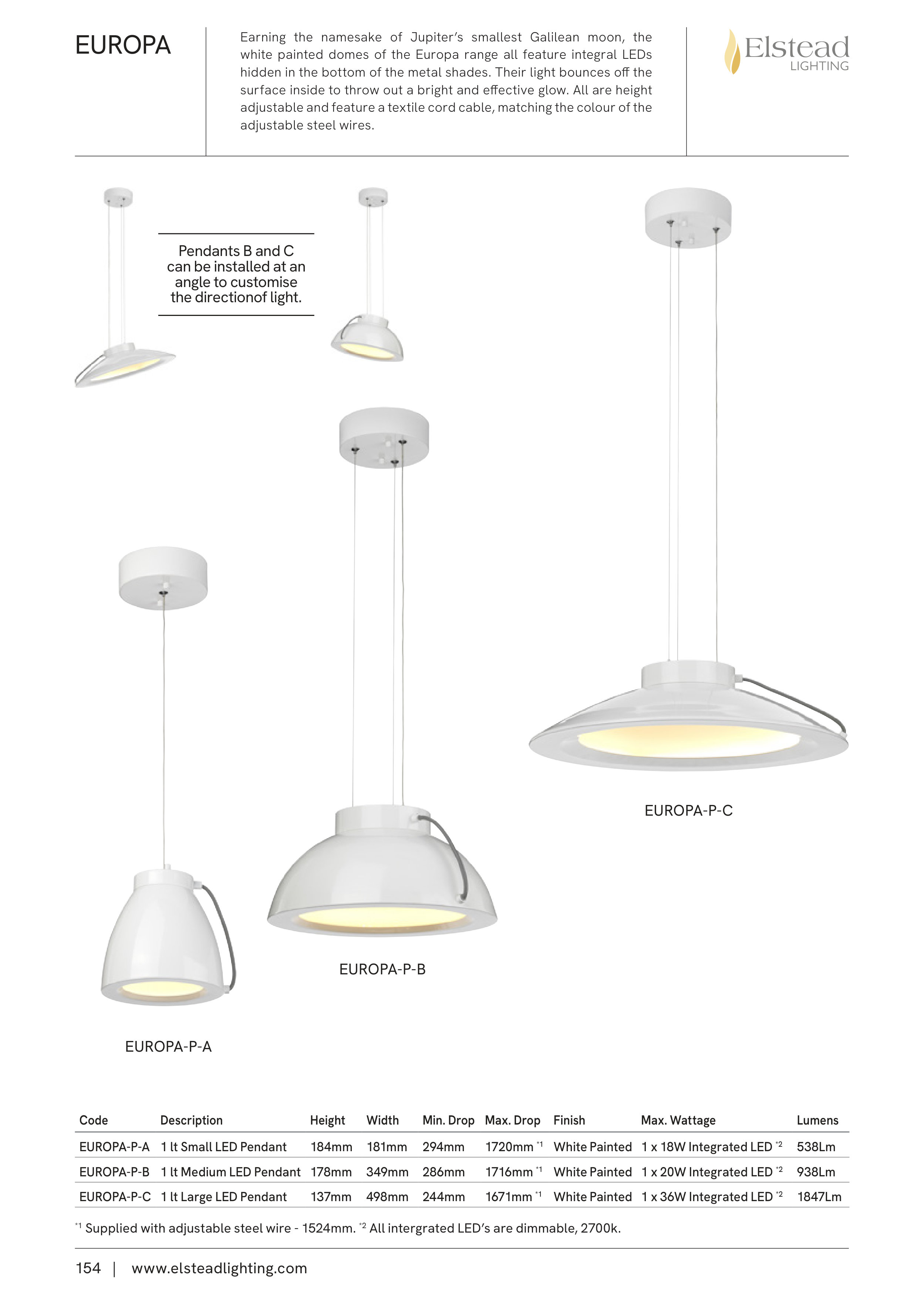 *1 Supplied with adjustable steel wire - 1524mm. *2 All intergrated LED’s are dimmable, 2700k.