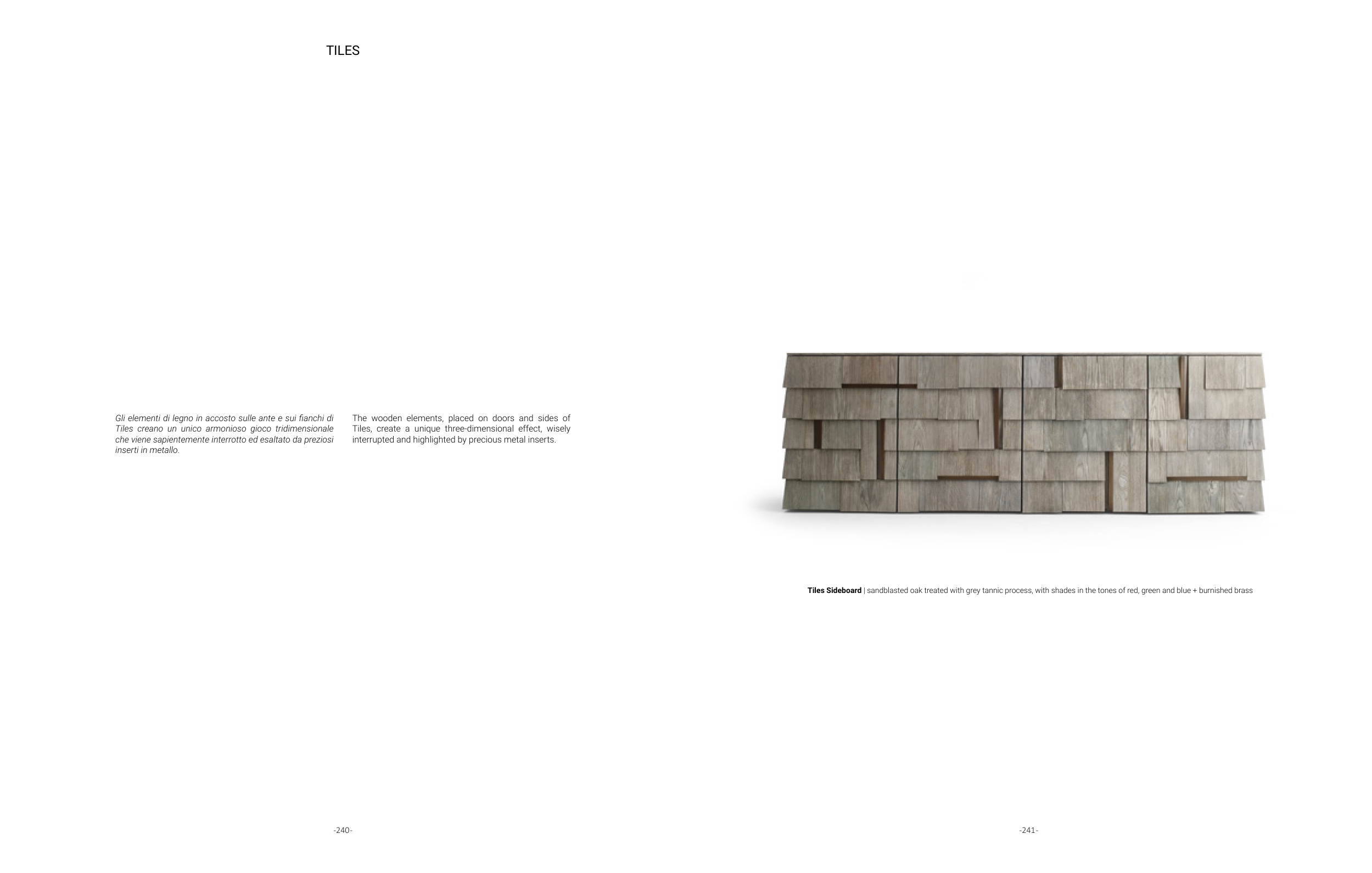 Tiles Sideboard | sandblasted oak treated with grey tannic process, with shades in the tones of red, green and blue + burnished brass