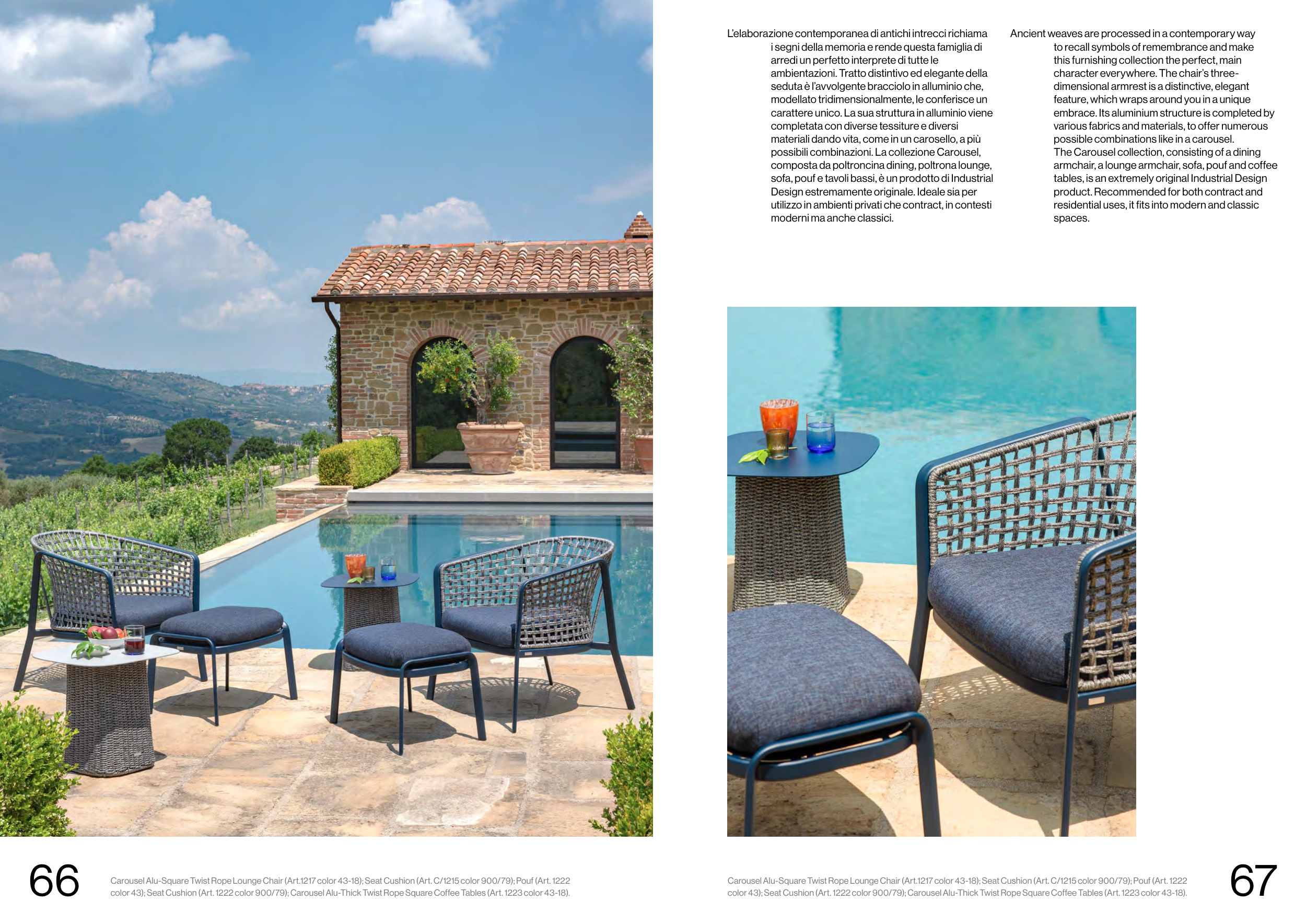color 43); Seat Cushion (Art. 1222 color 900/79); Carousel Alu-Thick Twist Rope Square Coffee Tables (Art. 1223 color 43-18).