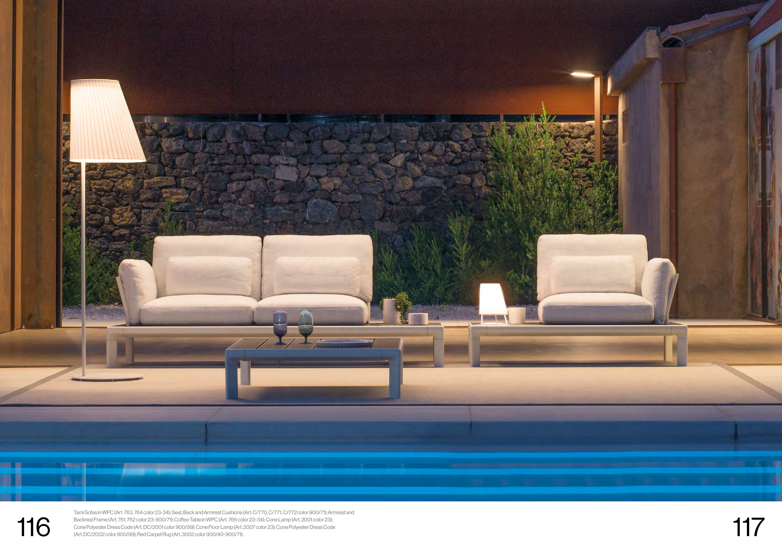 Backrest Frame (Art. 761, 762 color 23-900/71); Coffee Table in WPC (Art. 766 color 23-34); Cone Lamp (Art. 2001 color 23);