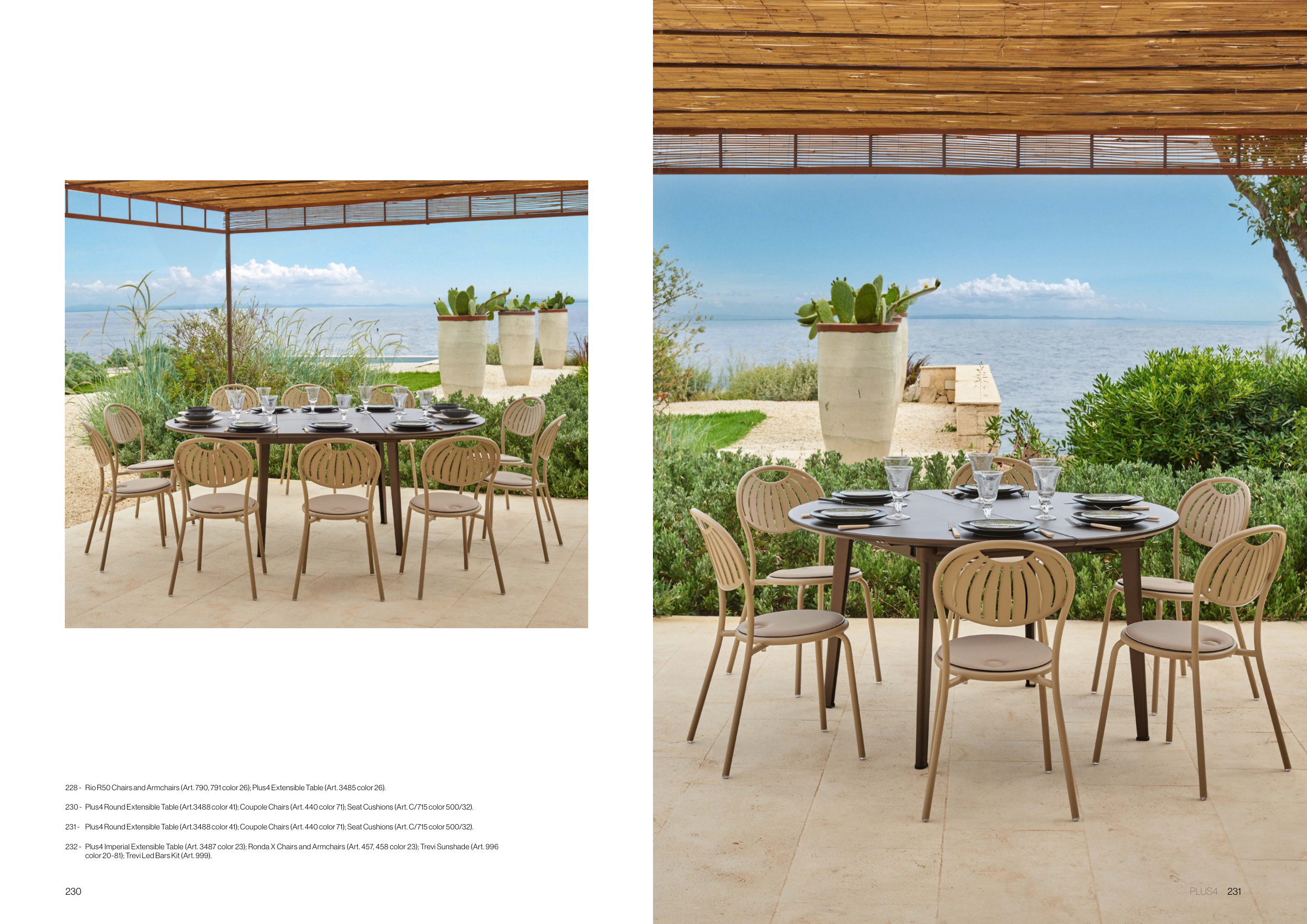 Plus4 Imperial Extensible Table (Art. 3487 color 23); Ronda X Chairs and Armchairs (Art. 457, 458 color 23); Trevi Sunshade (Art. 996