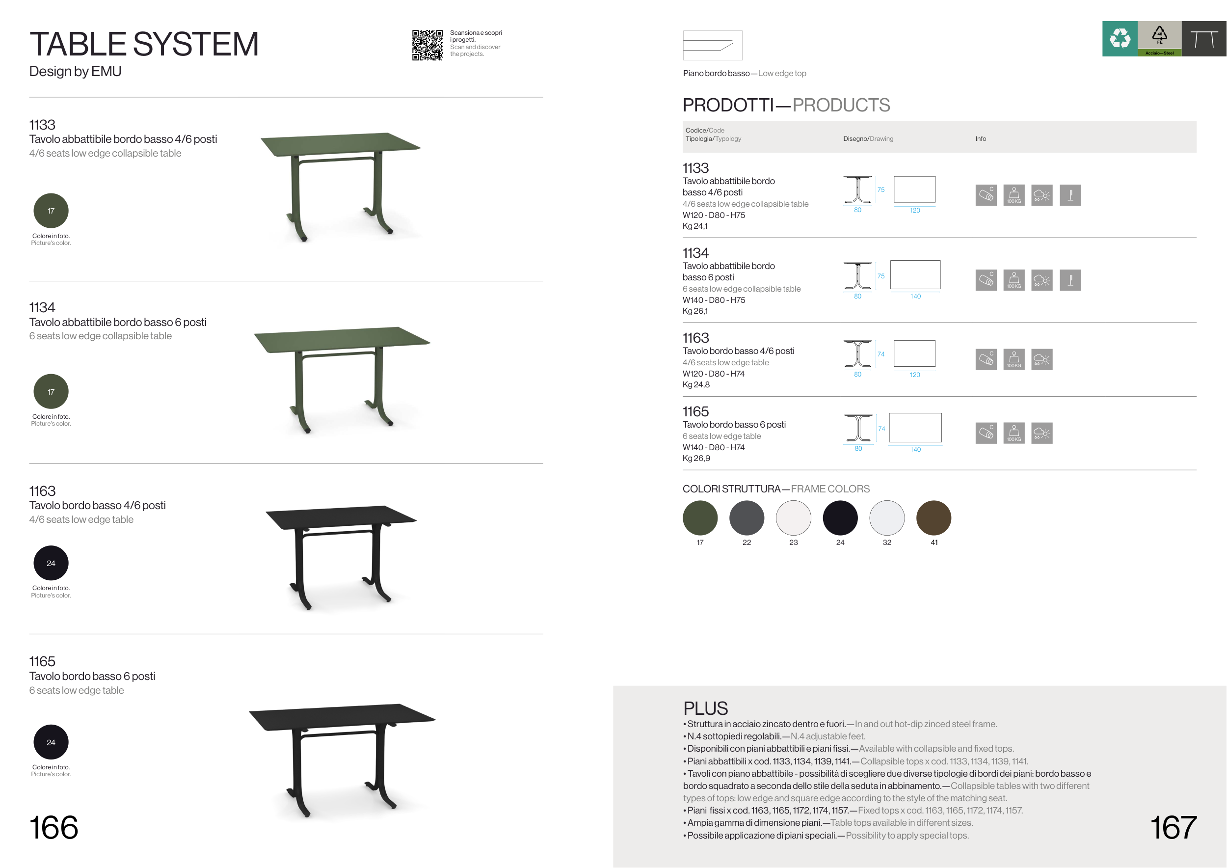 • Disponibili con piani abbattibili e piani fissi.—Available with collapsible and fixed tops.