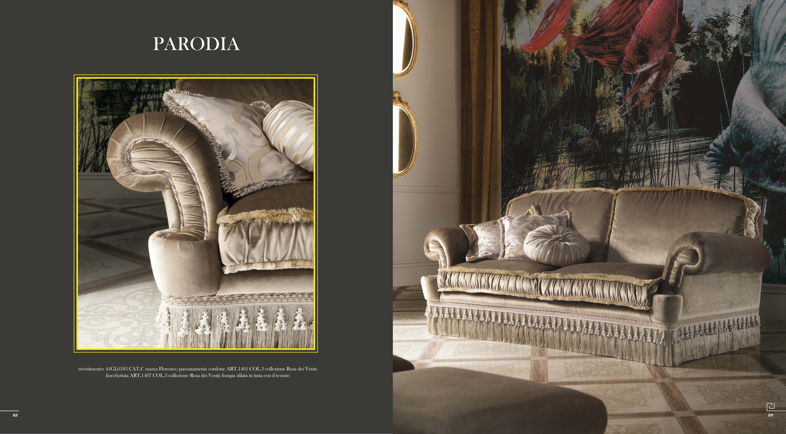 rivestimento: 41GL6183 CAT.C mazza Florence; passamaneria: cordone ART.1401 COL.3 collezione Rosa dei Venti;