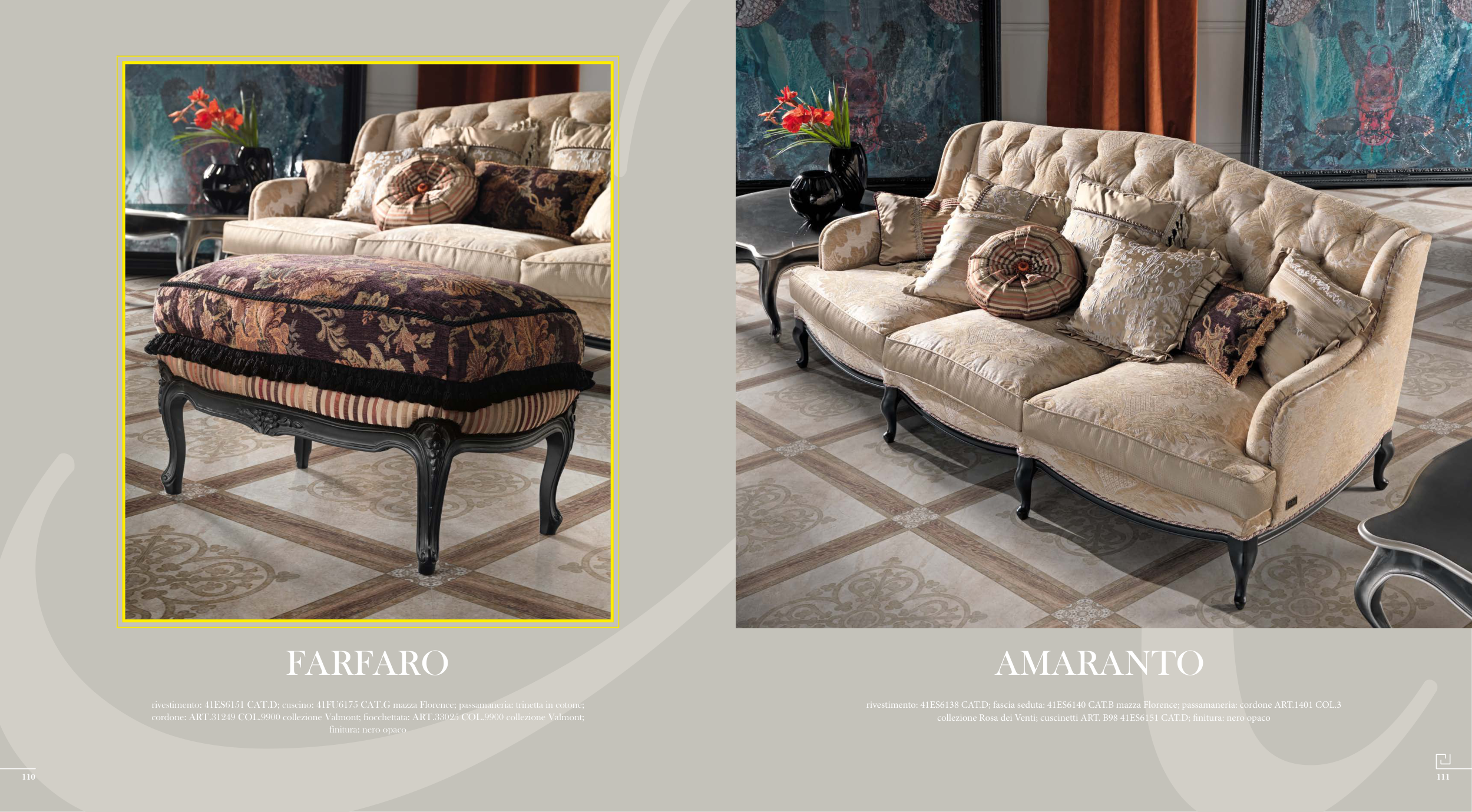 rivestimento: 41ES6151 CAT.D; cuscino: 41FU6175 CAT.G mazza Florence; passamaneria: trinetta in cotone;