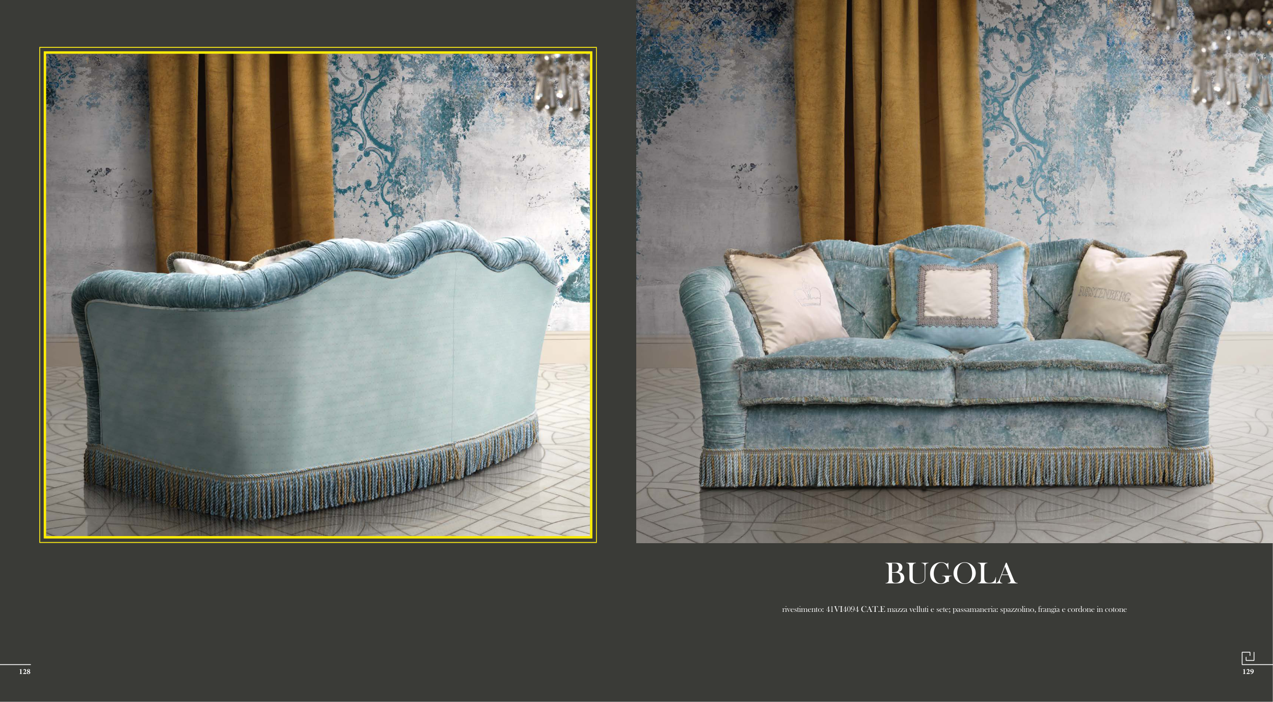 rivestimento: 41VI4094 CAT.E mazza velluti e sete; passamaneria: spazzolino, frangia e cordone in cotone