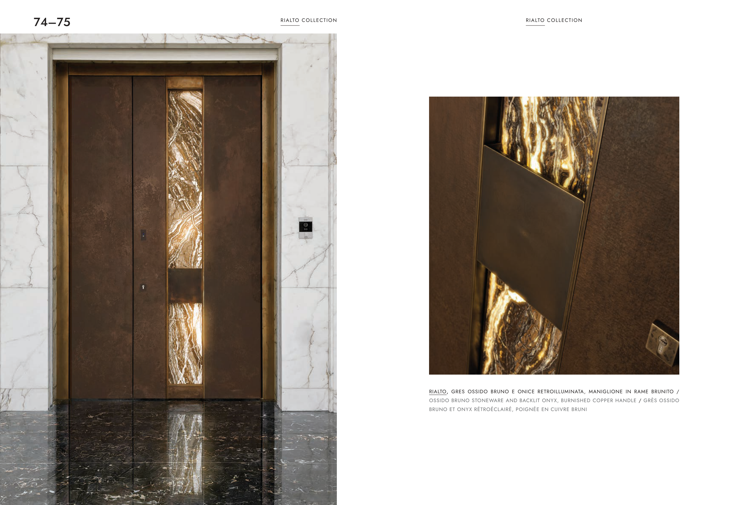 RIALTO, GRES OSSIDO BRUNO E ONICE RETROILLUMINATA, MANIGLIONE IN RAME BRUNITO /