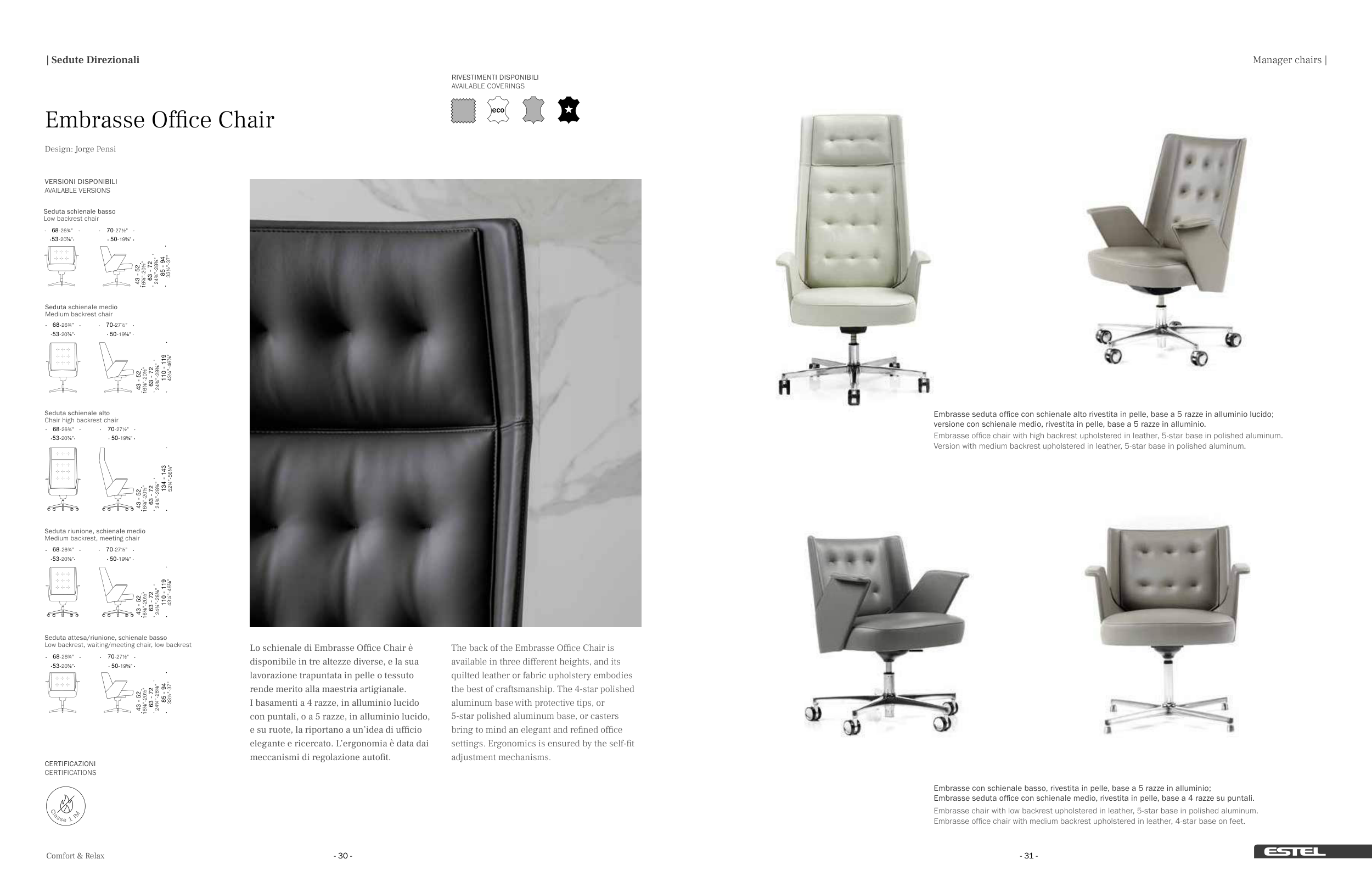 Embrasse office chair with high backrest upholstered in leather, 5-star base in polished aluminum.