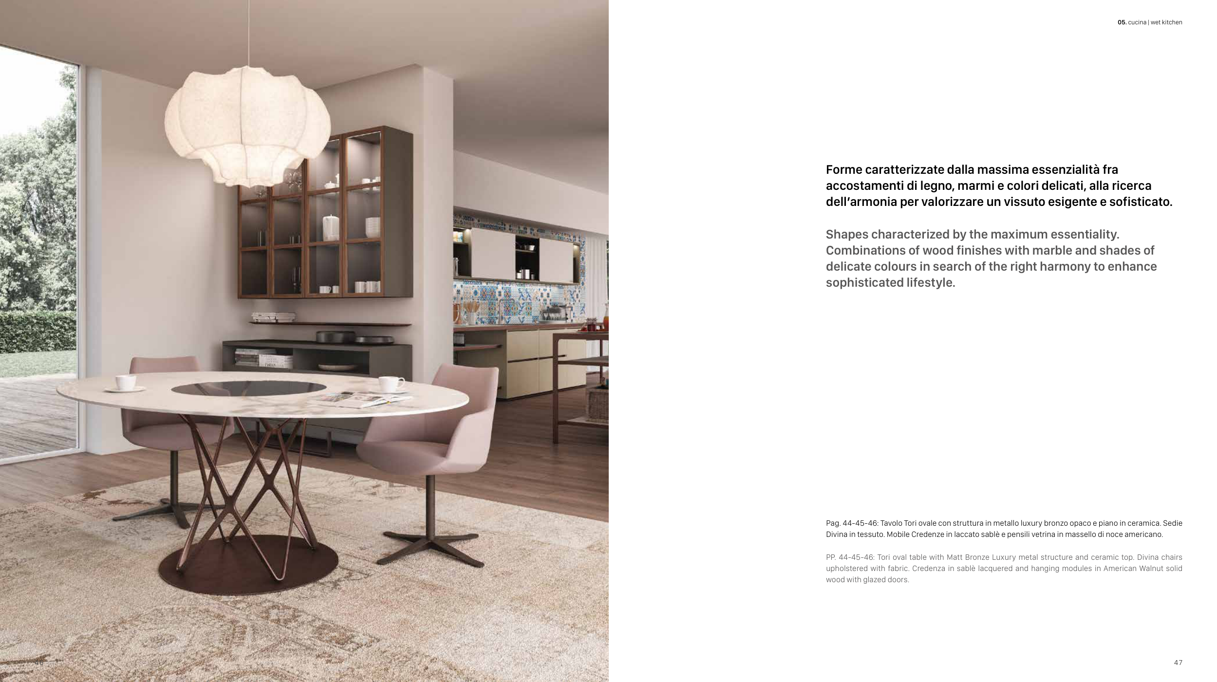 PP. 44-45-46: Tori oval table with Matt Bronze Luxury metal structure and ceramic top. Divina chairs