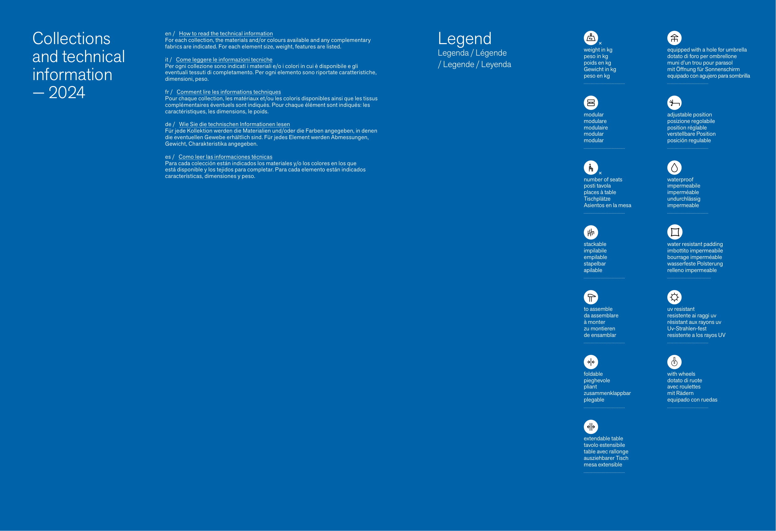 Per ogni collezione sono indicati i materiali e/o i colori in cui è disponibile e gli