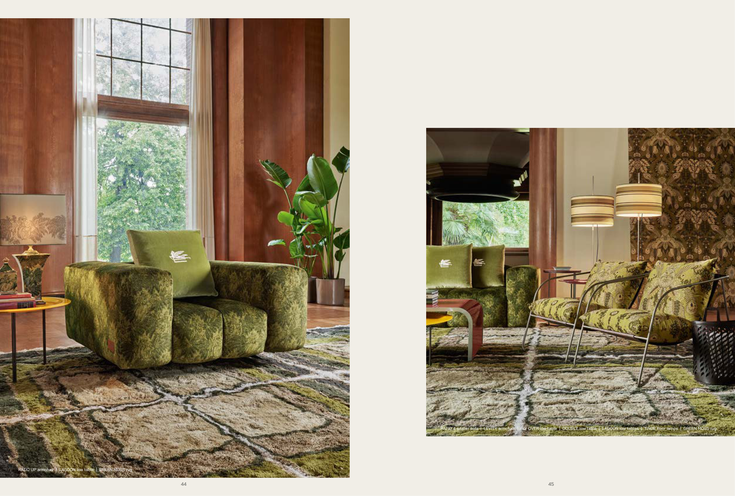 RATIO 4-seater sofa | LEVITY armchair | FLY OVER low table | DOUBLE low table | LAGOON low tables | TINGE floor lamps | GREEN MOSS rug