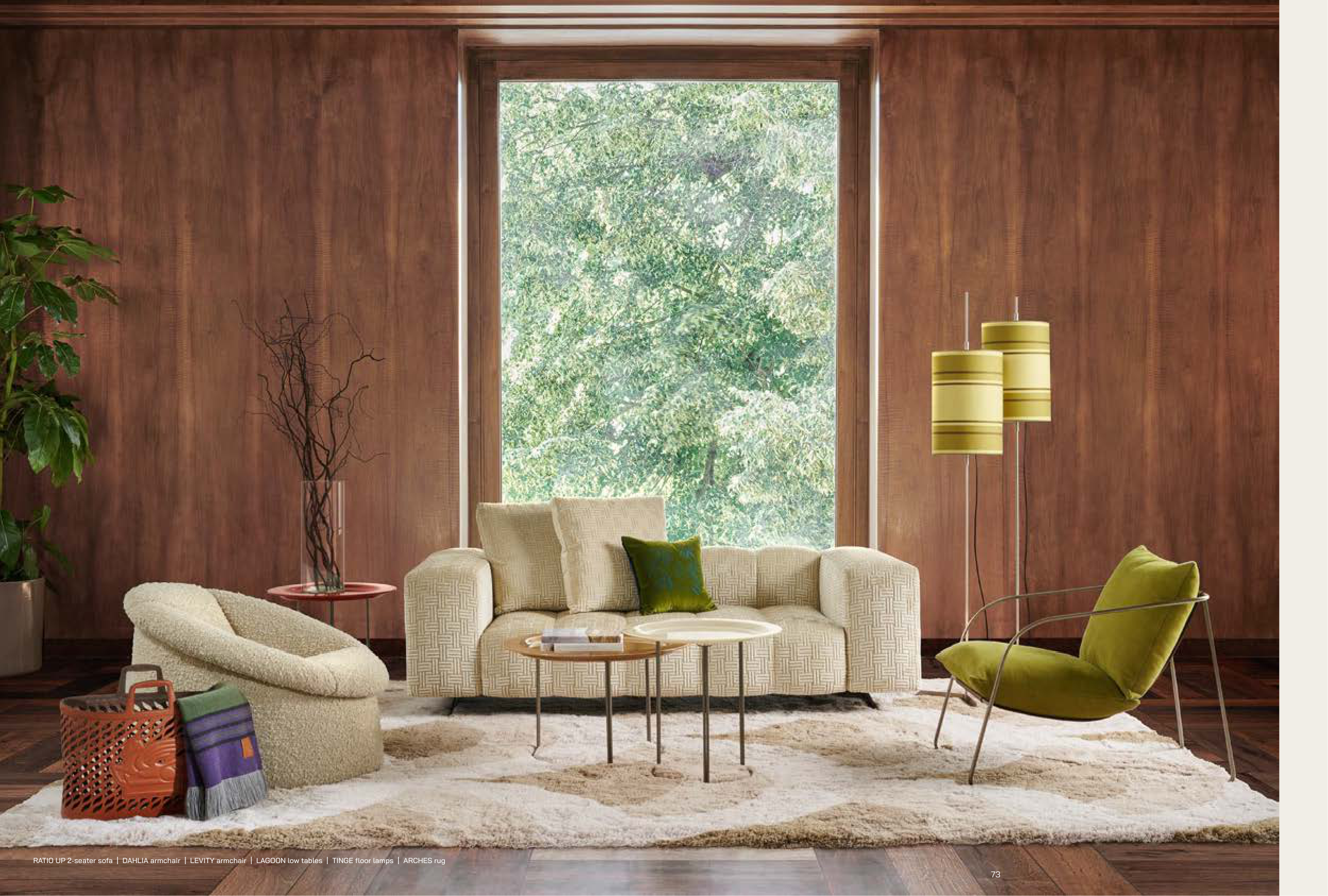 RATIO UP 2-seater sofa | DAHLIA armchair | LEVITY armchair | LAGOON low tables | TINGE floor lamps | ARCHES rug