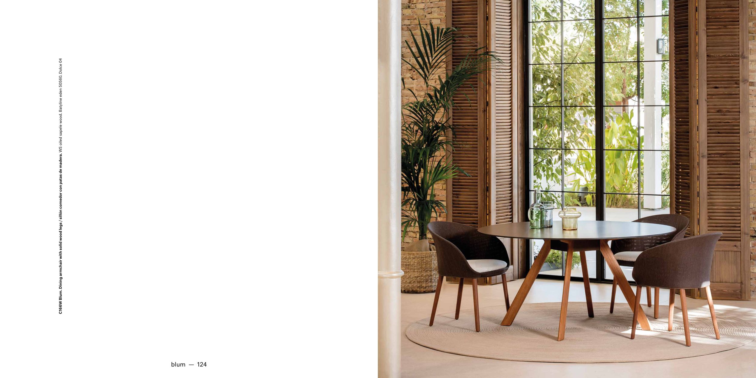 C166W Blum. Dining armchair with solid wood legs / sillón comedor con patas de madera. WS oiled sapele wood. Batyline eden 50560. Dolce 04