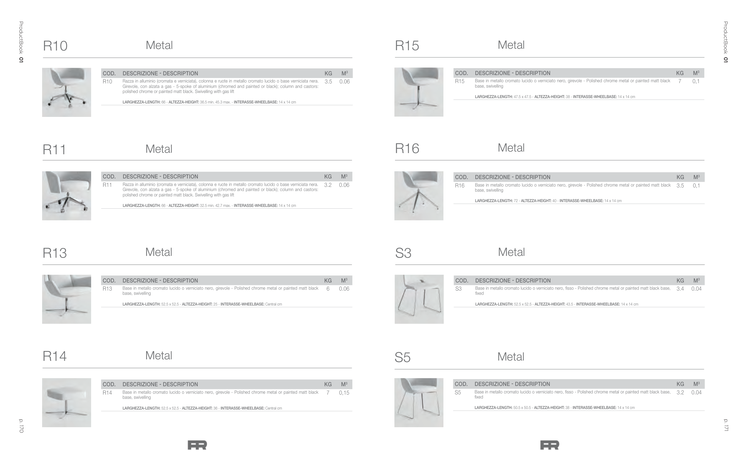 Razza in alluminio (cromata e verniciata), colonna e ruote in metallo cromato lucido o base verniciata nera.
