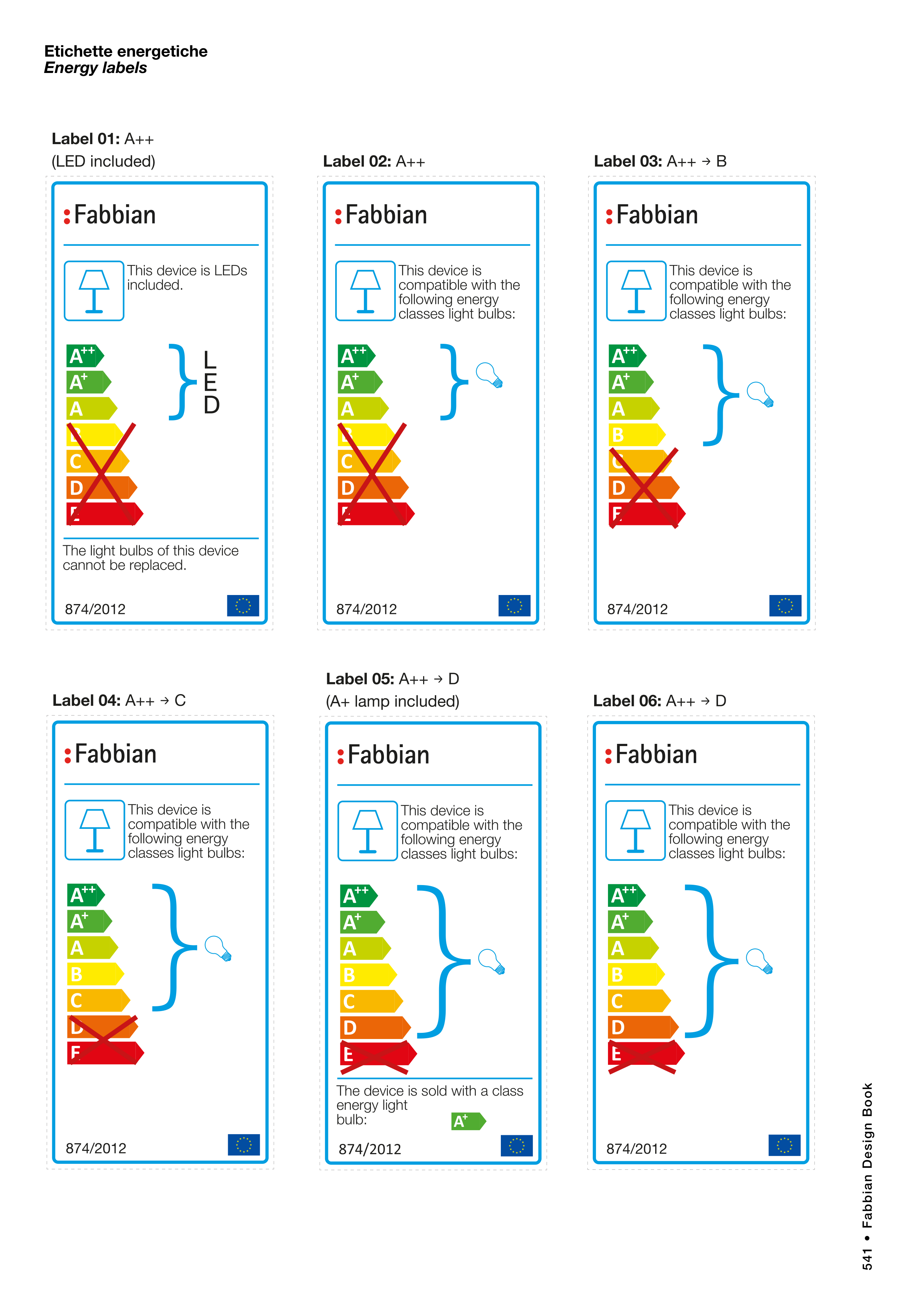 Etichette energetiche Energy labels A++ A A B C D E + A++ A A B C D E + A++ A A B C D E + A++ A A B C D E + A++ A A B C D E + Label 01: A++ (LED included) Label 02: A++ A++ A A B C D E + The device is sold with a class energy light bulb: A+ 541 • Fabbian Design Book